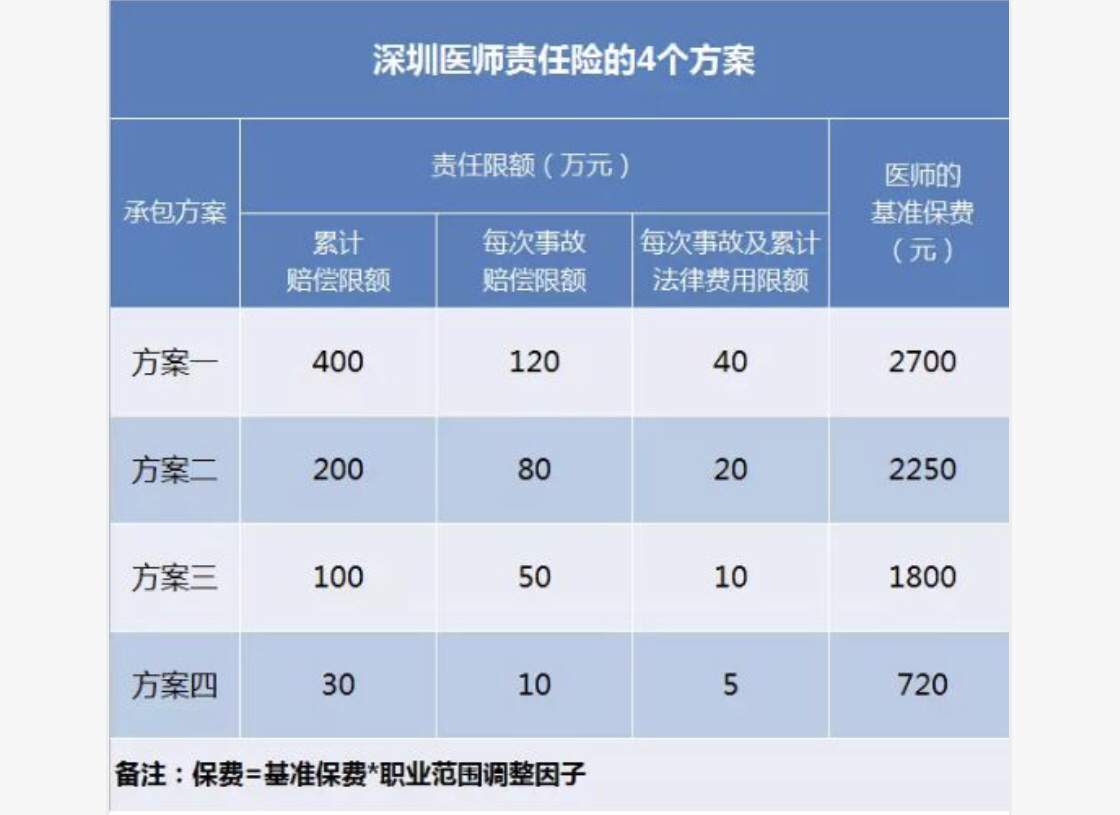 深圳的医师责任险则分为4档,基准保费分别为每年2700元、2250元、1800元和720元,累计赔偿限额分别为400万元、200万元、100万元和30万元,其对应的单笔事故赔偿限额分别为120万元、80万元、50万元和10万元。