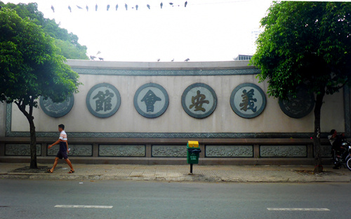 义安会馆坐落在华人区的一条街上,现在实际上是一间关帝庙。庙的正殿中间供着大义凝然的关公,右侧则供着海神天后娘娘,即妈祖。关帝庙和妈祖庙挨着建是潮州本土常见的现象,汕头市的“老妈宫”旁边就是关帝庙,但把妈祖作为陪祀则不多见。也许是地方不大,不能再建一座庙宇,便只能委屈海神娘娘了。据说这座关帝庙已经有200多年的历史了,现在是越南的国家级文化遗产。关帝庙的前面,是一个小广场。广场虽然不够“广”,看起来可能只有300平方米左右,但在西贡市,这可是个难得的公共场所。义安会馆的理事郑先生告诉我们,每年的元宵节,这里都会演戏酬神,也娱乐华人,通常是连续演出半个月,从正月十四演到正月底。一般情况是请越南本地的潮州剧团来演出,有重要事情时则邀请汕头潮剧院一团、二团或者潮州潮剧团等著名潮剧团来演出。家乡的潮剧团一来,演出往往是盛况空前,小广场上人山人海,潮州人、广府人,还有越南人都来赶热闹。正殿两侧,左侧厢房是客家会馆,右侧厢房就是义安会馆。