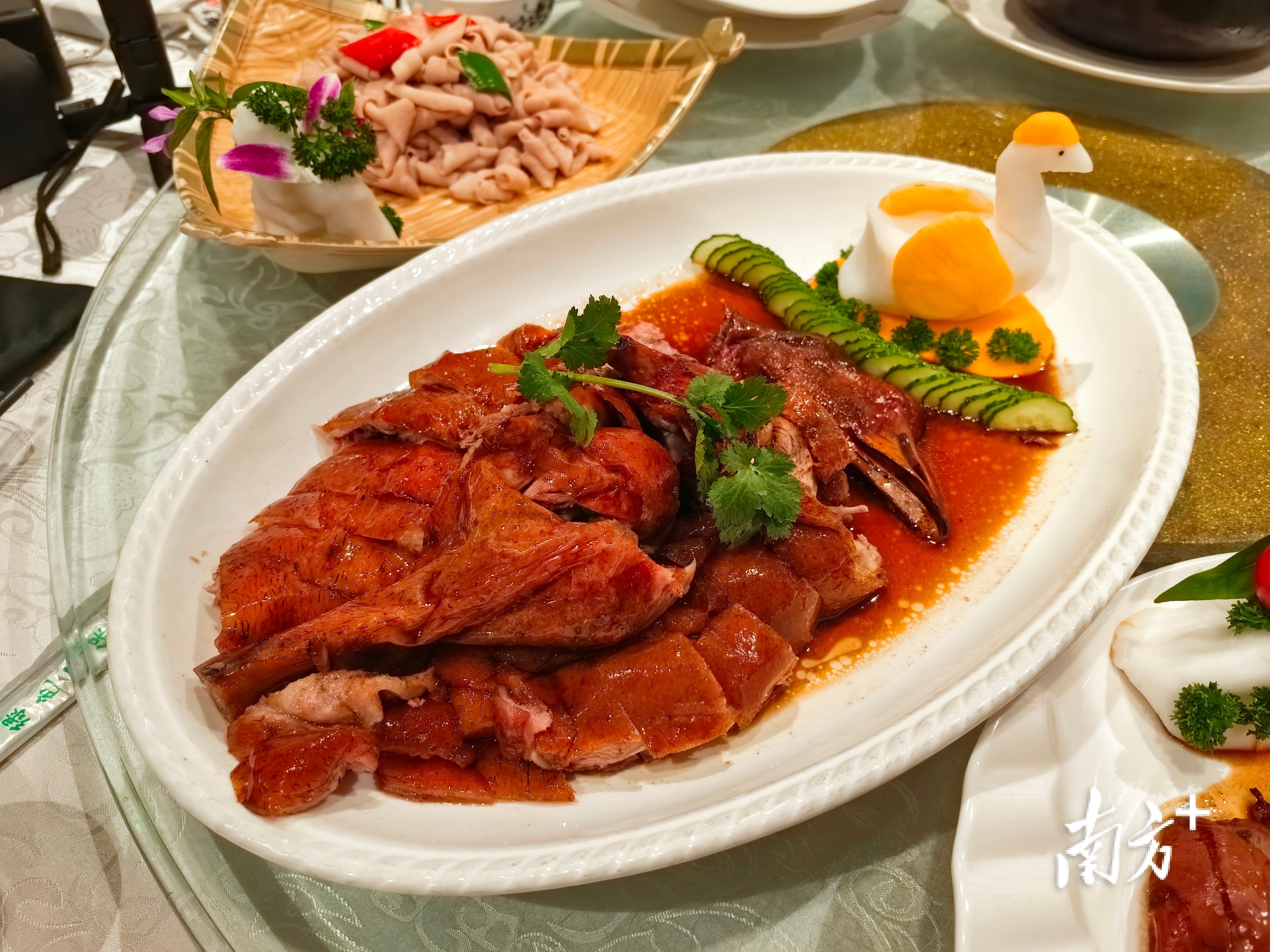 拔萝卜出了一身汗,中午必须上点“硬菜”。古井镇是新会历史文化名镇,饮食文化源远流长,其中古井烧鹅以其独特的古法炮制、精选的鹅品种、荔枝木独有的香味最负盛名。
