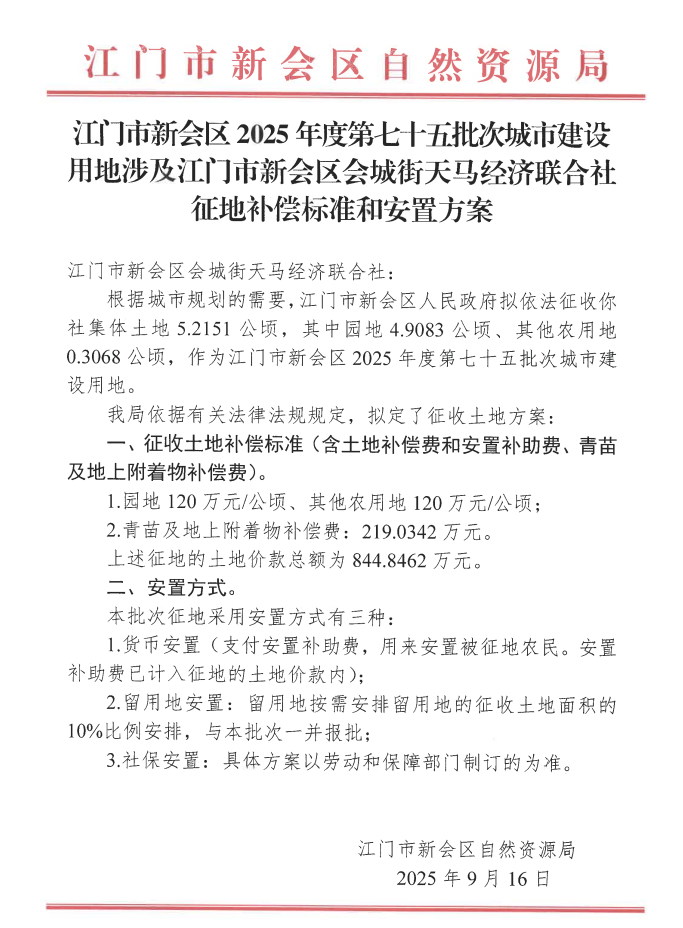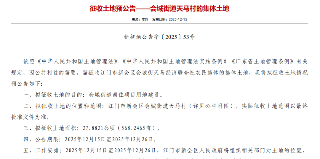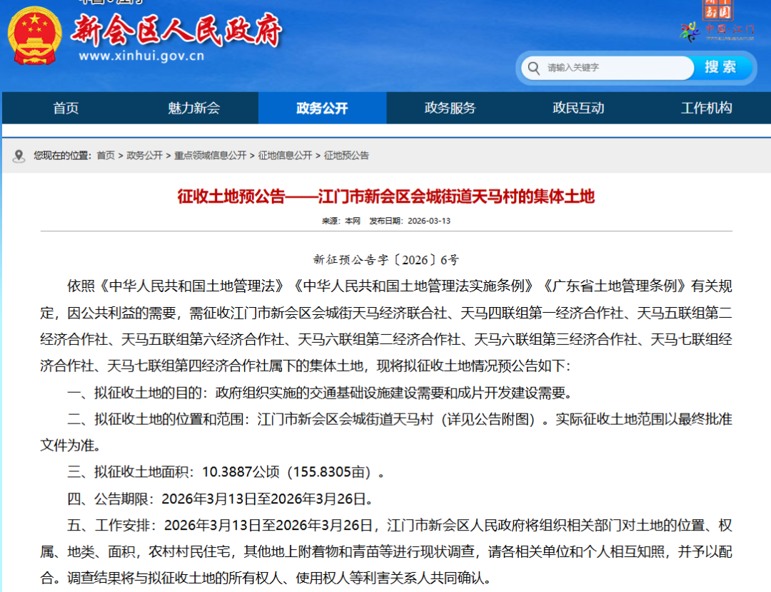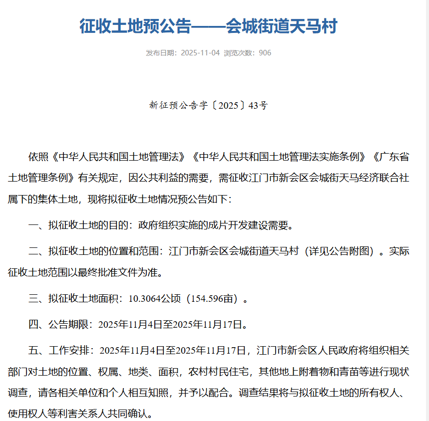 今年1月28日,新会区就曾发布公告,完成对会城街天马经济联合社5.2151公顷(约78.26亩)集体土地的征收工作,土地价款总额为844.8462万元,主要用于由政府组织实施的教育类公共事业项目建设。