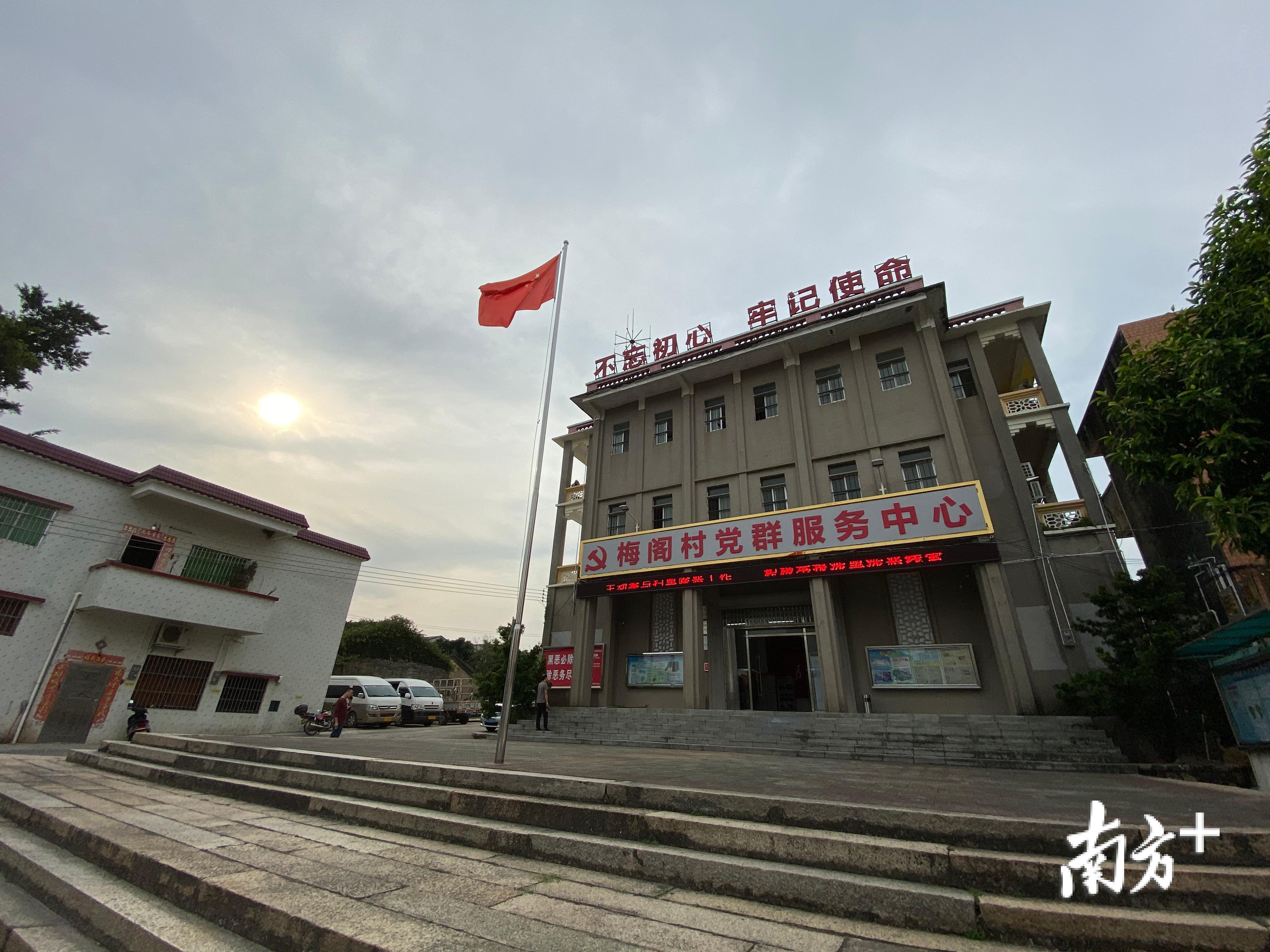 穿过梅阁村党群服务中心,可以看到一个新修葺的会堂,台上鲜红的党旗首先映入眼帘。整齐的桌椅、古朴的建筑元素、现代化的多媒体设备,在这里齐聚一堂。
