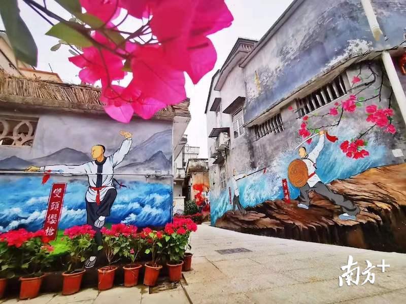 走进京梅村,具有历史文化底蕴的蔡李佛拳武术气息充盈于巷弄间。依托蔡李佛拳文化,京梅村全力打造的“十大精品项目”——位于蔡李佛始祖馆旁、占地面积约1万平方米的蔡李佛武术文化广场即将完成升级改造,整体外观大气磅礴;藏有蔡李佛拳“武功秘籍”的“出神入化巷”已成为一处网红旅游打卡地,巷道沿线多为清末民国时期的古建筑,生动有趣的墙绘、雕塑以及别具特色的铁打馆、梅花酿酒家等沿途景点为来往游客增添不少旅游新鲜体验。