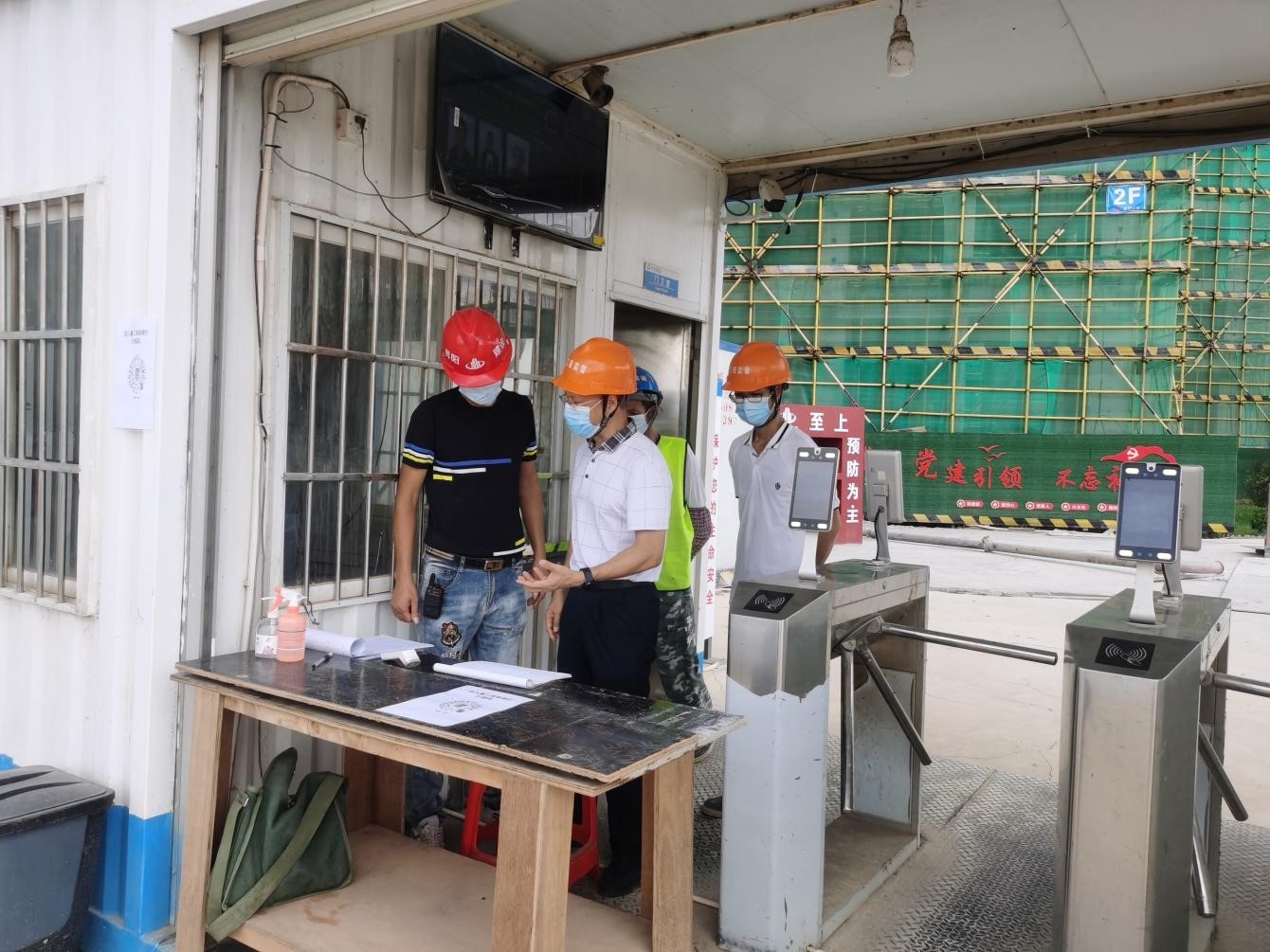 党员义工指引建筑工人排队等候。