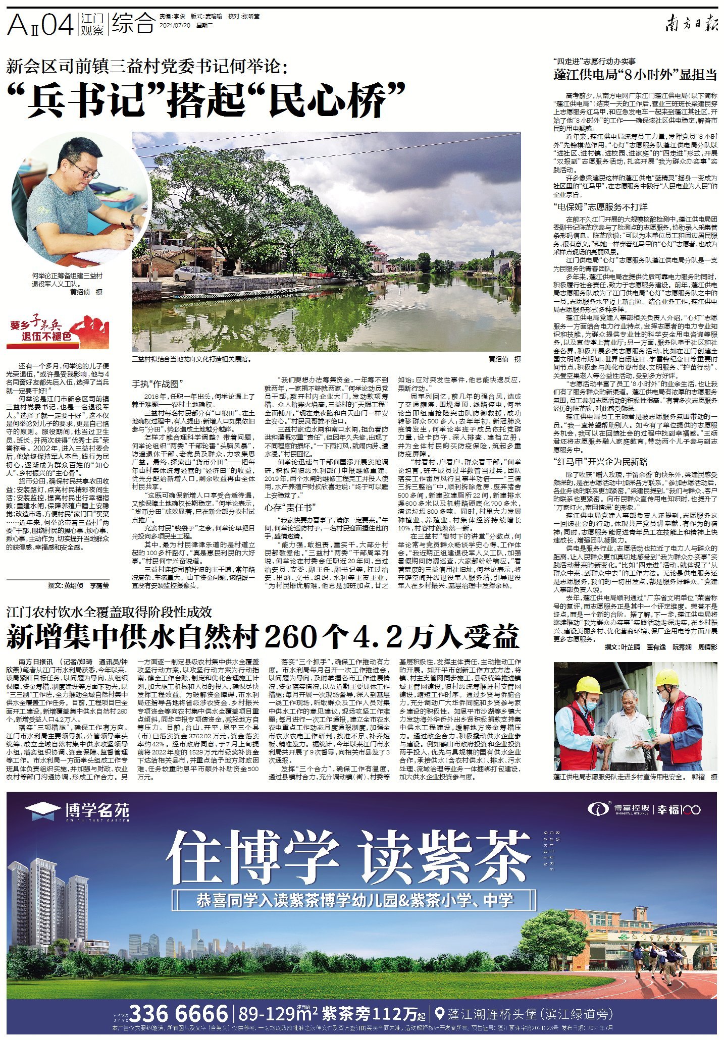 何举论是江门市新会区司前镇三益村党委书记,也是一名退役军人。“选择了就一定要干好”,这不仅是何举论对儿子的要求,更是自己恪守的原则。服役期间,他当过卫生员、班长,并两次获得“优秀士兵”荣誉称号。2002年,进入三益村委会后,他始终保持军人本色,践行为民初心,逐渐成为群众百姓的“知心人”、乡村振兴的“主心骨”。
