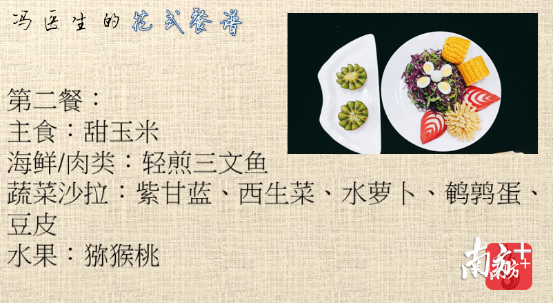 视频中的早餐四大类大家记住了吗?重要事情敲黑板:主食(以粗粮为主)、蔬菜、海鲜/肉类、水果。此外,冯医生的早餐也是少油少盐的呦~煎制三文鱼主要靠鱼自身的油脂烹熟的,而且这三份早餐是完全不含糖的,非常适合瘦身群体。