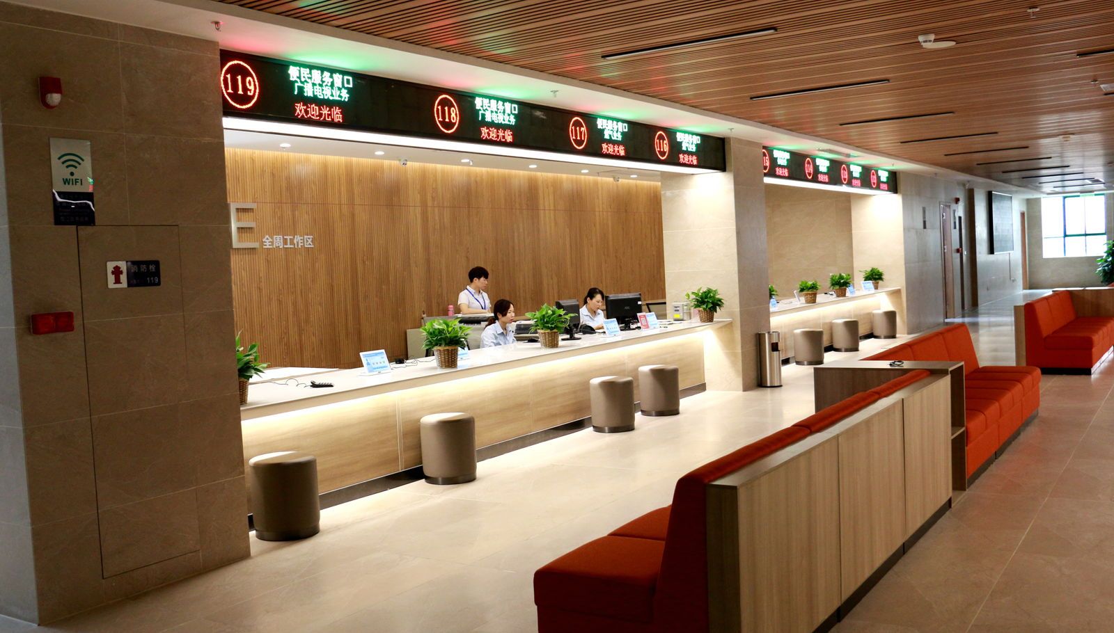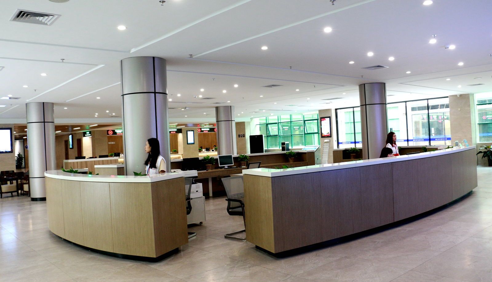 政务服务中心一楼为自助服务区,进驻基层公共服务、社保、税务、烟草、公安户政、出入境、违章罚单缴交以及银行ATM机等自助终端机,提供“24小时”全天候自助服务;二楼为实体办事大厅主厅,分为综合业务区、公安专区、社会服务专区、自然资源业务区、工程报建区、经营许可区等,设置综合服务窗口和专业窗口共计145个。除此之外,还规划设置咨询区、阅读区、填表区、等候区等功能区,提供导办咨询、自助计算机、打印复印、上网、茶水、免费WIFI覆盖、手机充电、报刊书籍等服务,切实满足不同人群的办事需求。