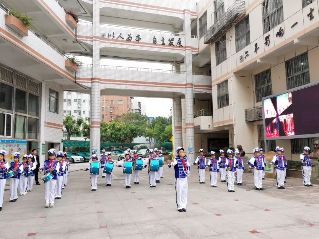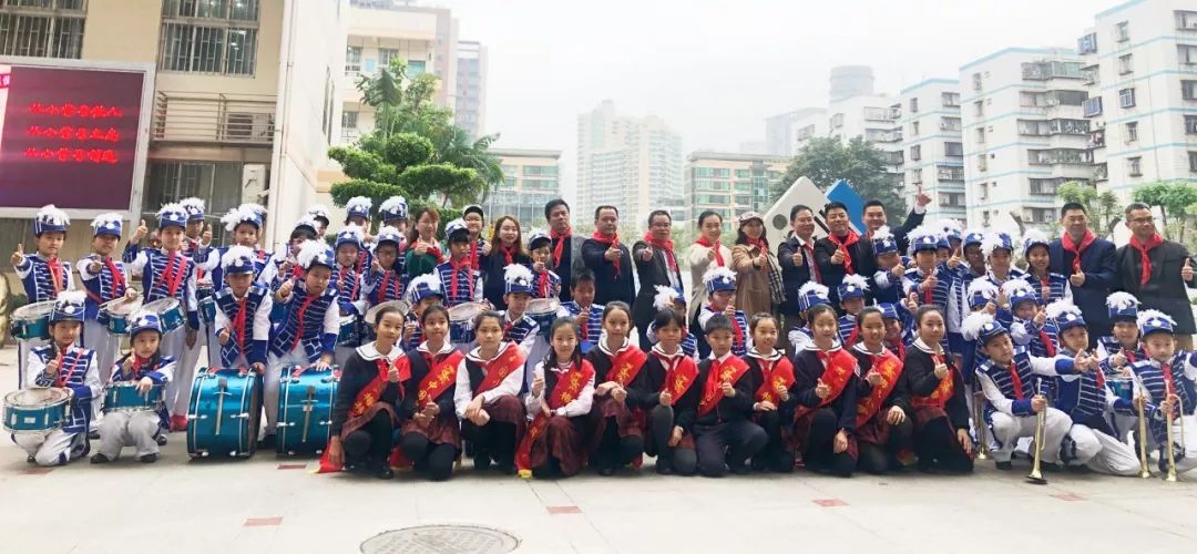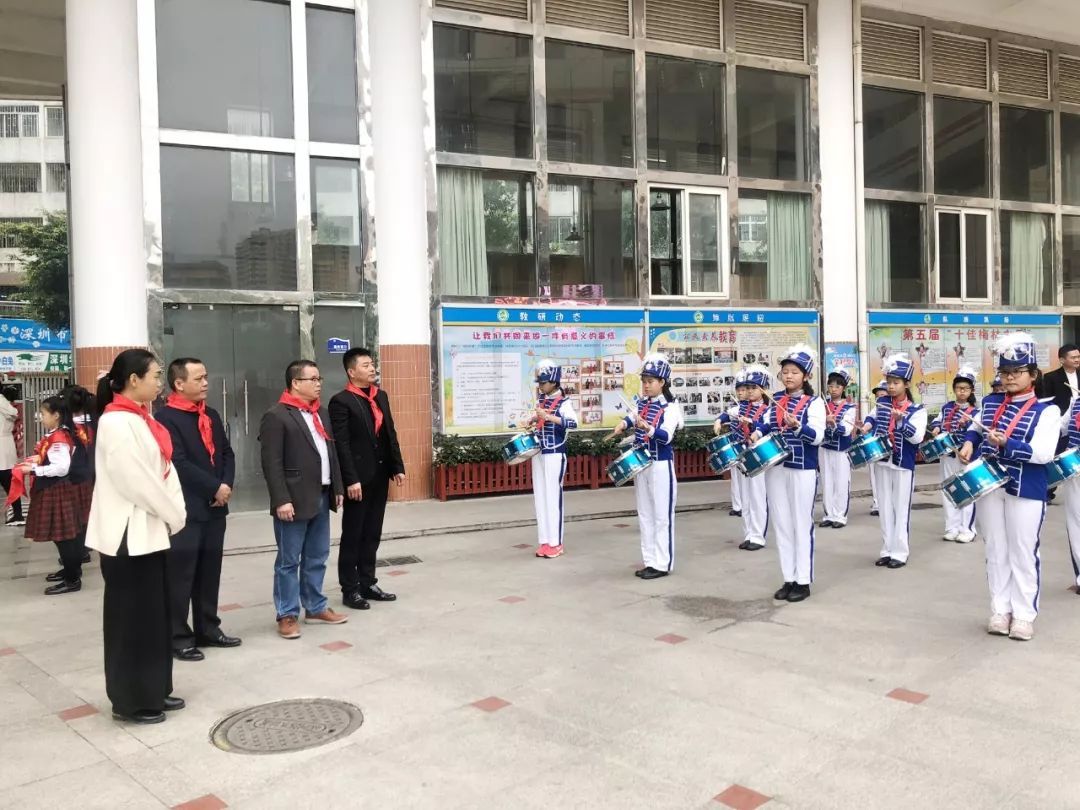 督导组一行在黎敏成校长、陈俊兴副校长、赵宏建副校长的陪同下观摩了学校鼓号队的精彩表演,并与队员们合影留念。