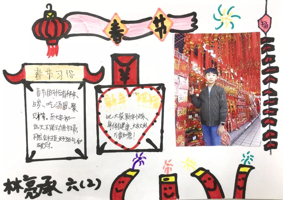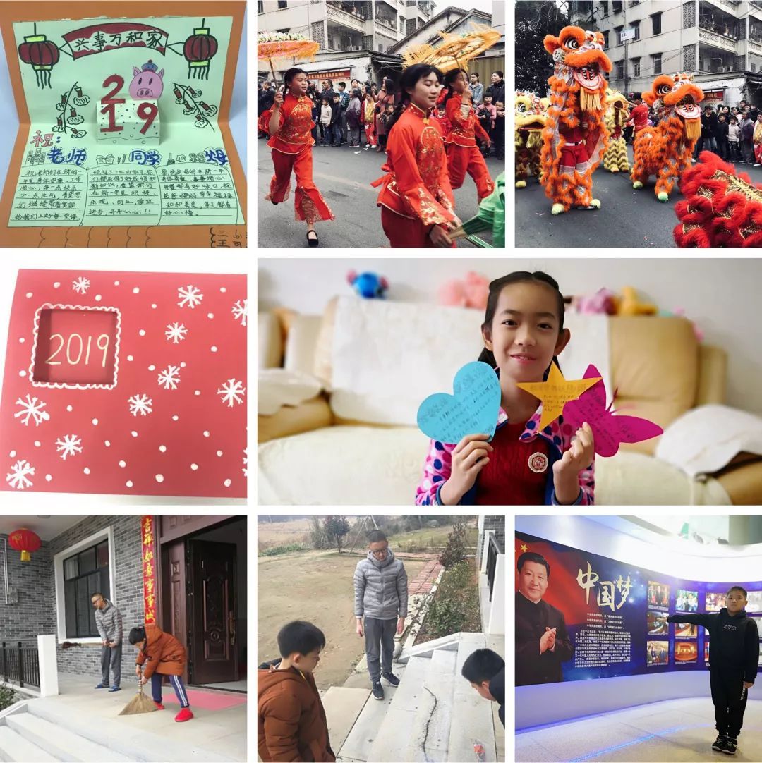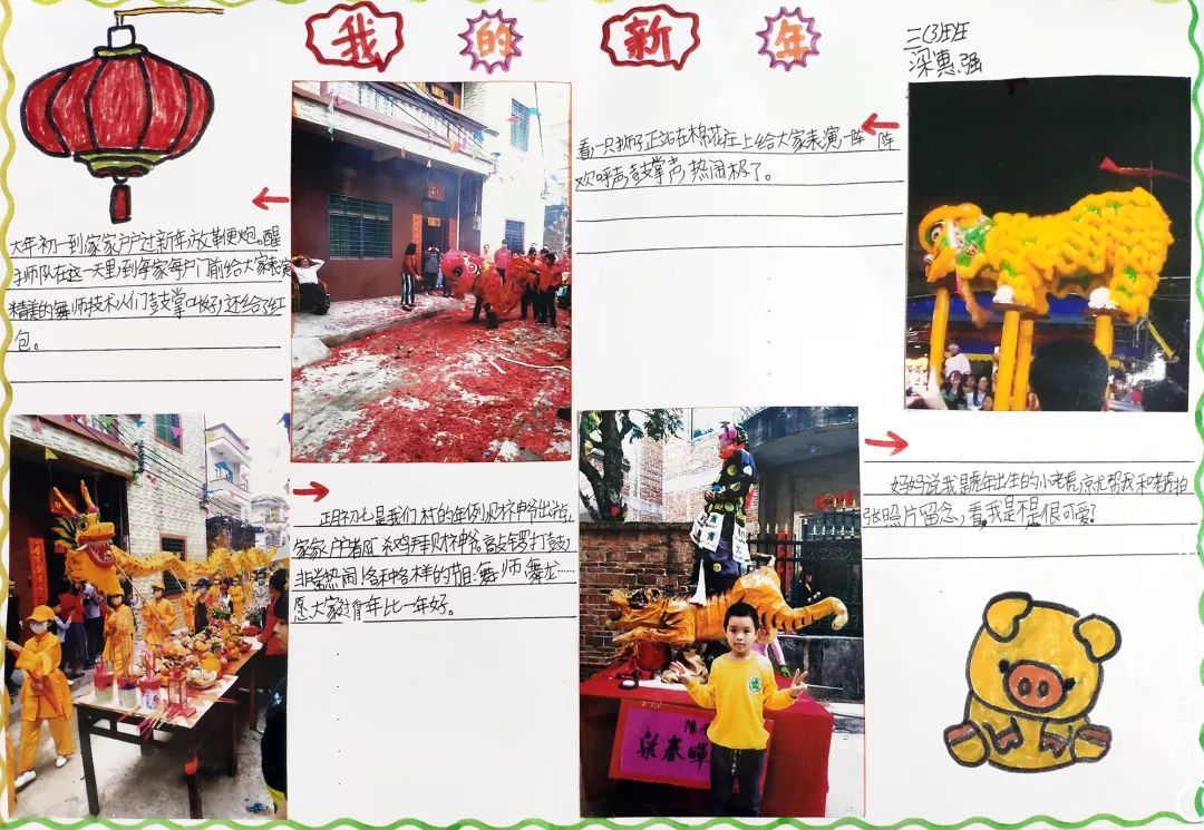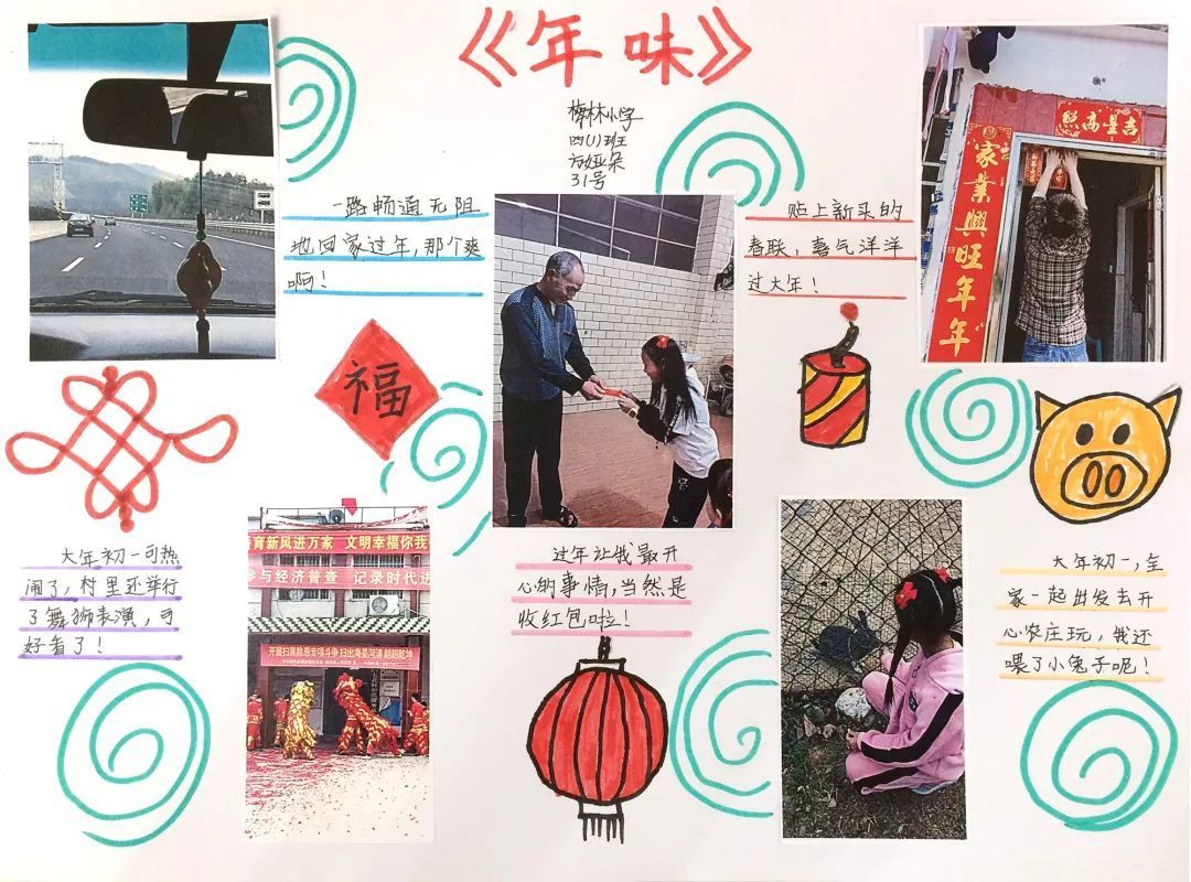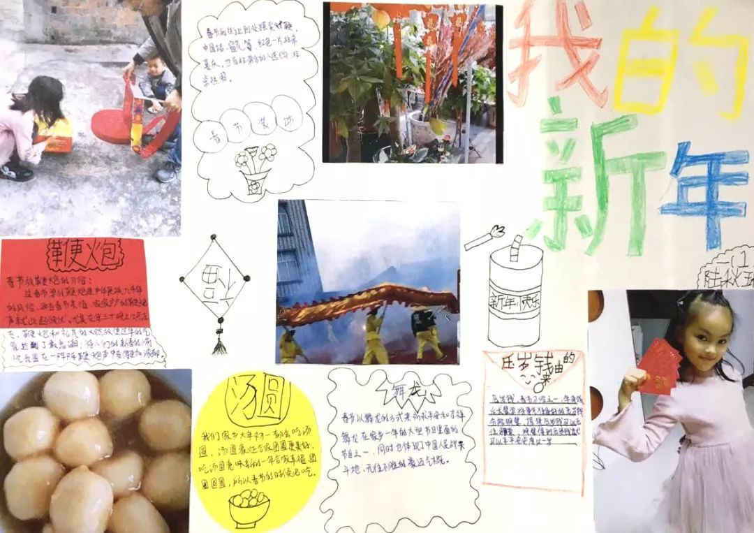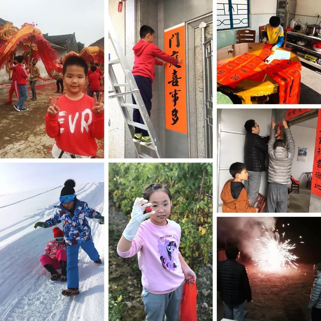 快看,我们在放烟花、写春联、贴春联、舞龙舞狮、做新年贺卡等有趣的年俗活动中体验浓浓年味呢!