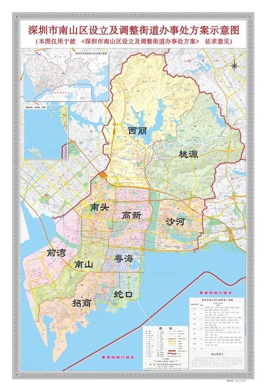 资料显示,南山区成立于1990年9月,总面积约187.47平方公里,下设南头、南山、西丽、沙河、蛇口、招商、粤海、桃源8个街道办事处,100个社区工作站和107个社区居委会。全区常住人口2018年末约150万人,而实际管理人口已超过220万人。2018年全年实现本地生产总值5018亿元,总量居全省区(县)第一。南山区现有街道布局定型于建区之初,17年来未进行过调整,街道办事处设置情况已难以满足精细化管理的需求。与此同时,南山区辖区总面积超过罗湖、福田两区之和。罗湖和福田均为10个街道办事处,而南山现有8个街道办事处,现行区划设置跟不上城市发展需要。