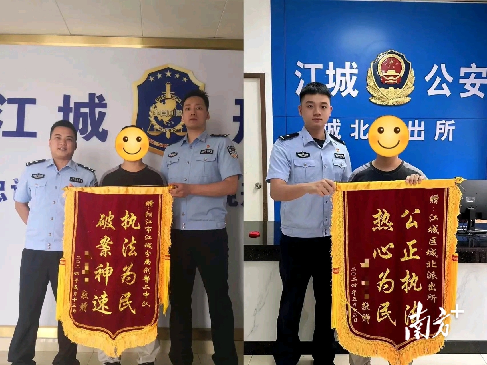5月13日,事主林先生满怀感激地带着两面锦旗,分别送至阳江市公安局江城分局城北派出所和刑侦大队,感谢办案民警快速破案和追赃挽损。