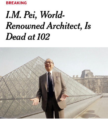 美国当地时间5月16日,享誉世界的华裔建筑大师贝聿铭去世,享年102岁。贝聿铭一生有70多件作品,其中最著名作品包括法国卢浮宫的玻璃金字塔。最终,他的封笔之作回到中国,孕育了“苏州博物馆”。