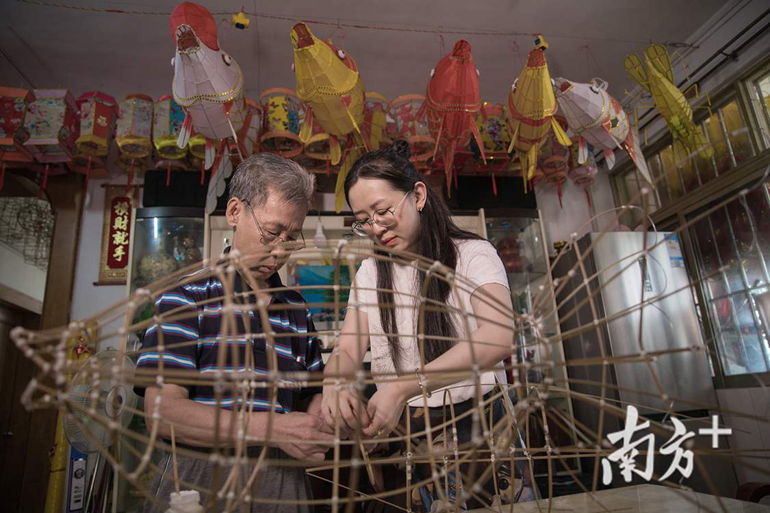 自此,温秋雯走上改造传统花灯之路,设法将现代设计和非遗手工艺相结合。她走遍广州、佛山、梅州,最后去到顺德,向70多岁的大良鱼灯手艺人潘培森拜师,学习如何用竹篾编织花灯骨架。
