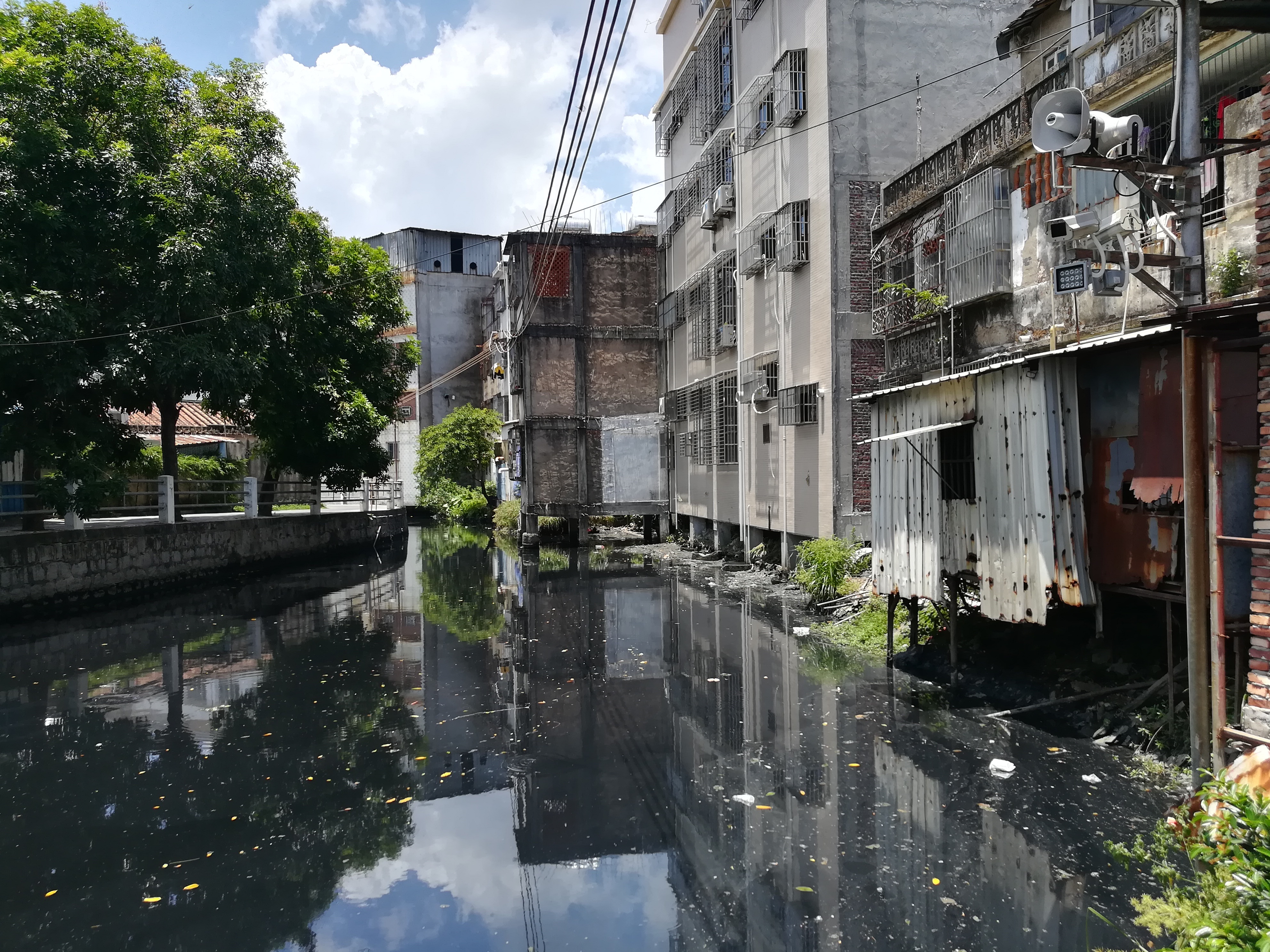 继续往上游前行,在陈店镇第一中学附近河段,刚下车臭味就扑面而来,粘稠的油污、泡沫、各色垃圾杂物漂浮河面,上方蚊虫飞舞。再往前三四百米,陈店大溪再度陡然变窄,这时它穿过的是陈店镇最为热闹的综合市场一带,这里的小商铺、小作坊和路边摊档林立,栋栋城中村常见的握手楼沿河岸分布,一支支排污管从建筑的底部伸出。