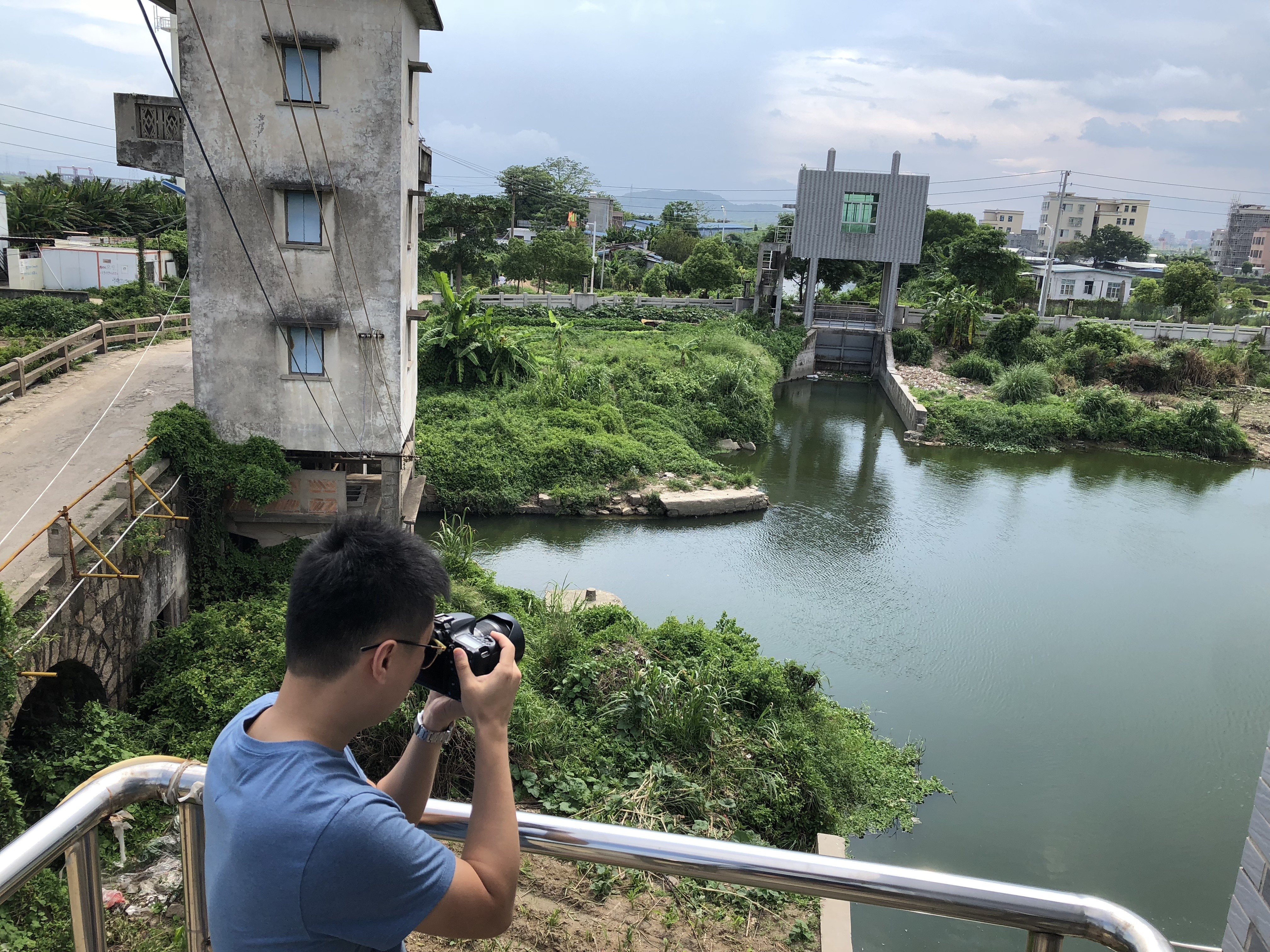 记者在前溪水闸旁拍照记录