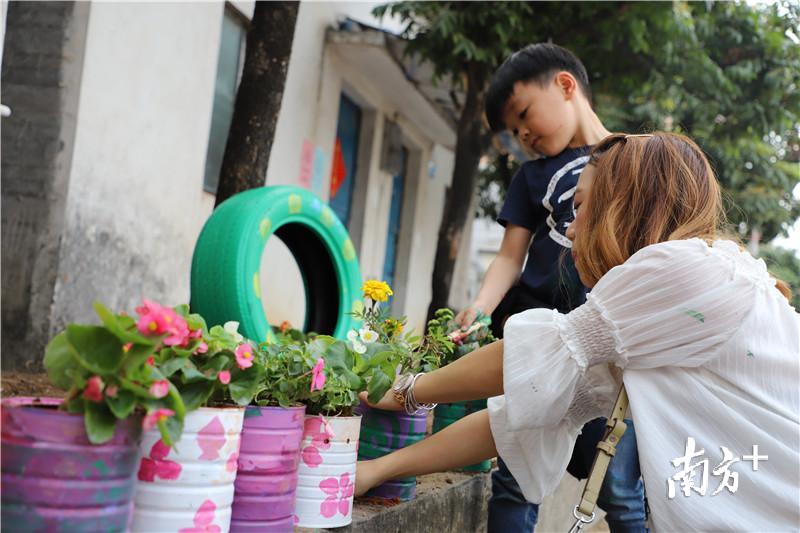 今年初,作为试点单位,半仙山村在横沥社会治理协同创新中心的推动下自发组织了一支特别的“居民自治”队伍,并在社工和志愿者的协助下,开始在村里打造“边角花园”。村里的家长和小朋友们自由组合,分组对路边、墙角的荒废区域进行清理,并利用春节过后居民清理出来的年花、修车行和家里的废旧轮胎、奶粉罐等旧物,种上鲜艳的小花小草,再通过画笔、颜料等绘上创意颜色和造型,原本垃圾、杂物乱堆放的角落像变魔术般成了“口袋花园”,面貌焕然一新,呈现出一副美丽温馨的村庄新环境。