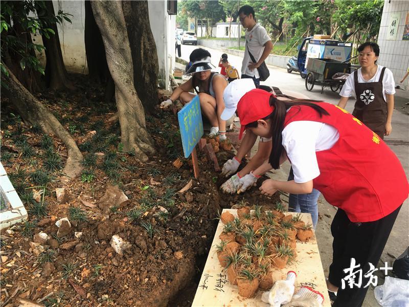 彩绘轮胎、紫藤花架、手绘墙画……走进横沥镇半仙山村村委会附近、朱氏宗祠古韵的老街巷,路边、墙角、绿化带上,目之所及到处是花花绿绿的植物,老旧街道俨然一条美丽的花园长廊。而谁能想到,这个长廊几个月前还是一片荒废的绿化带。