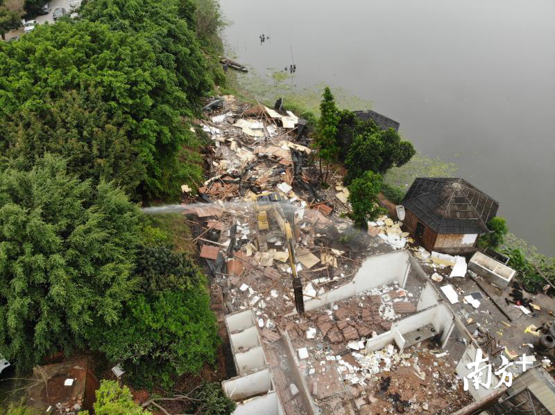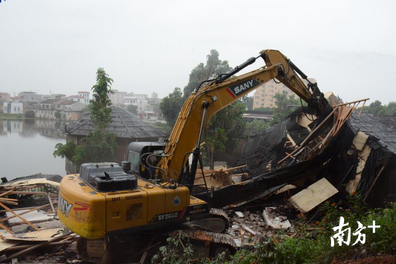 4月2日,由横沥镇“违法用地、违法建设”联合执法工作领导小组牵头、联合城管、公安、村(社区)组成的多部门执法队伍对该农庄开展联合拆除行动。拆违现场拉起了警戒线,在大型挖掘机的巨臂重击下,违法建筑瞬间被“削顶”,整个拆除工作安全有序进行。