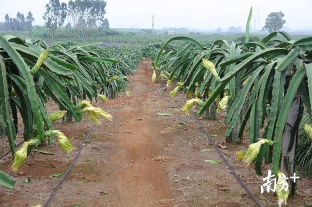 火龙果田地里已经挂上嫩黄的花,即将迎来今年第一批丰收的果实。