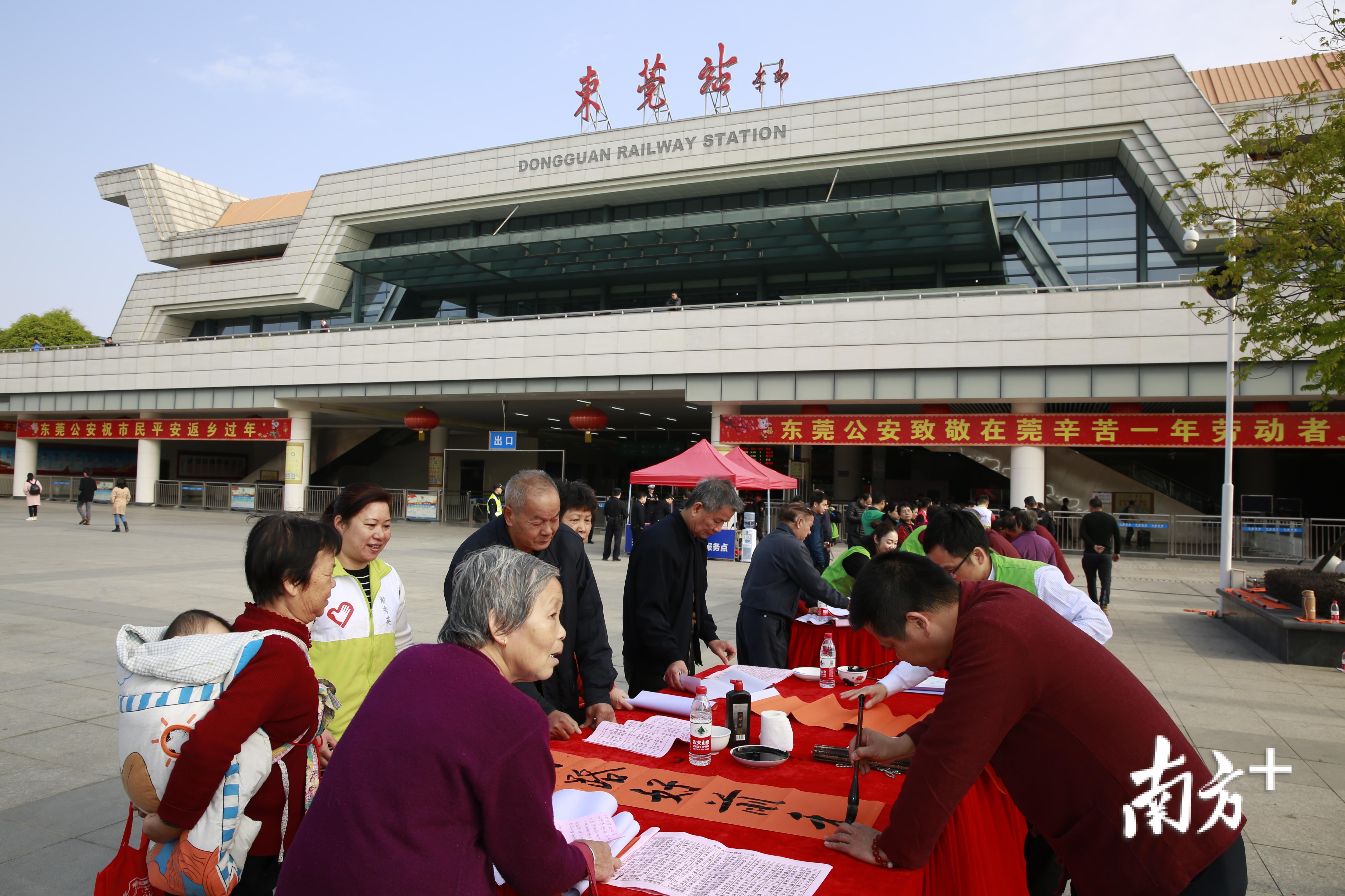 当天,茶山镇“道德春联进万家”挥春送福活动也走进东莞火车站茶山侧广场,组织镇内书法名家为旅客免费写春联,让旅客带着满满的祝福踏上回家路。