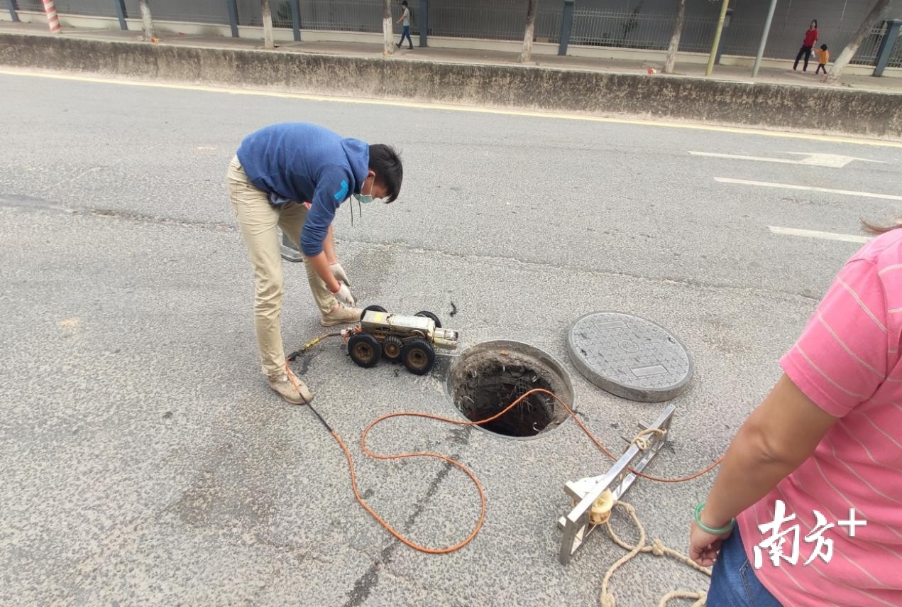 机器人能够在排水管里自由穿行,用内窥电视检测系统拍摄乳白色废水流向,高效追踪废水源头。经摸查,机器人发现乳白色废水从一厂区周边的雨水沟排放口流出。