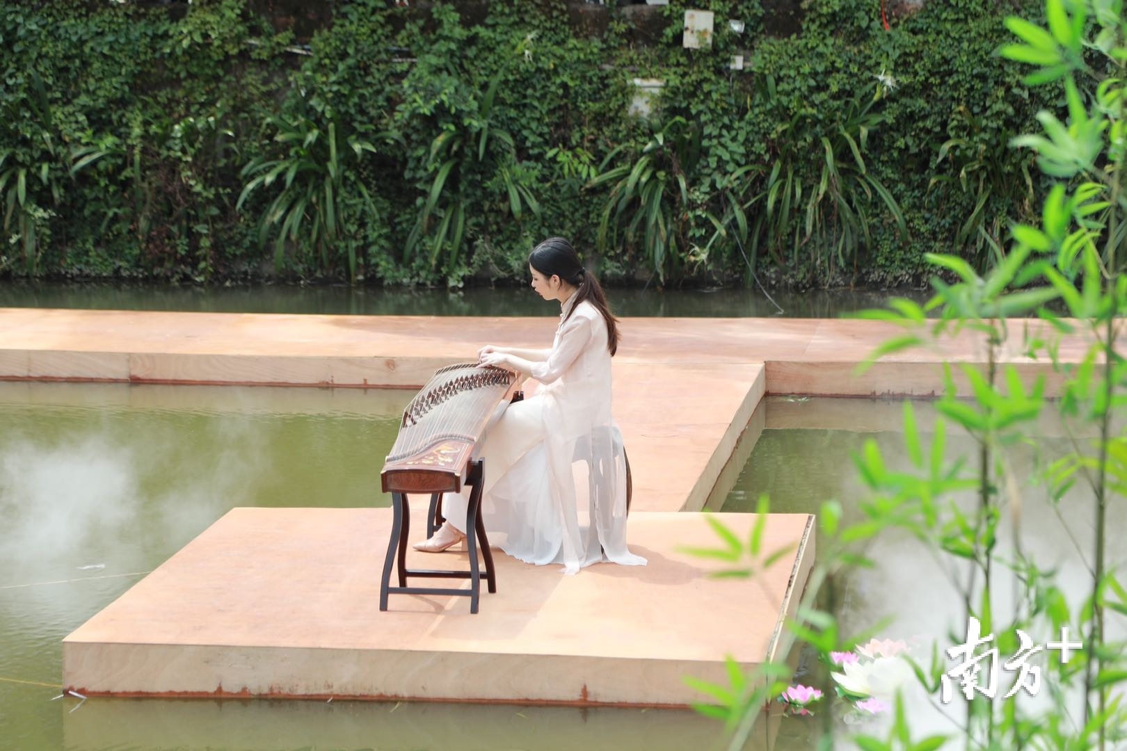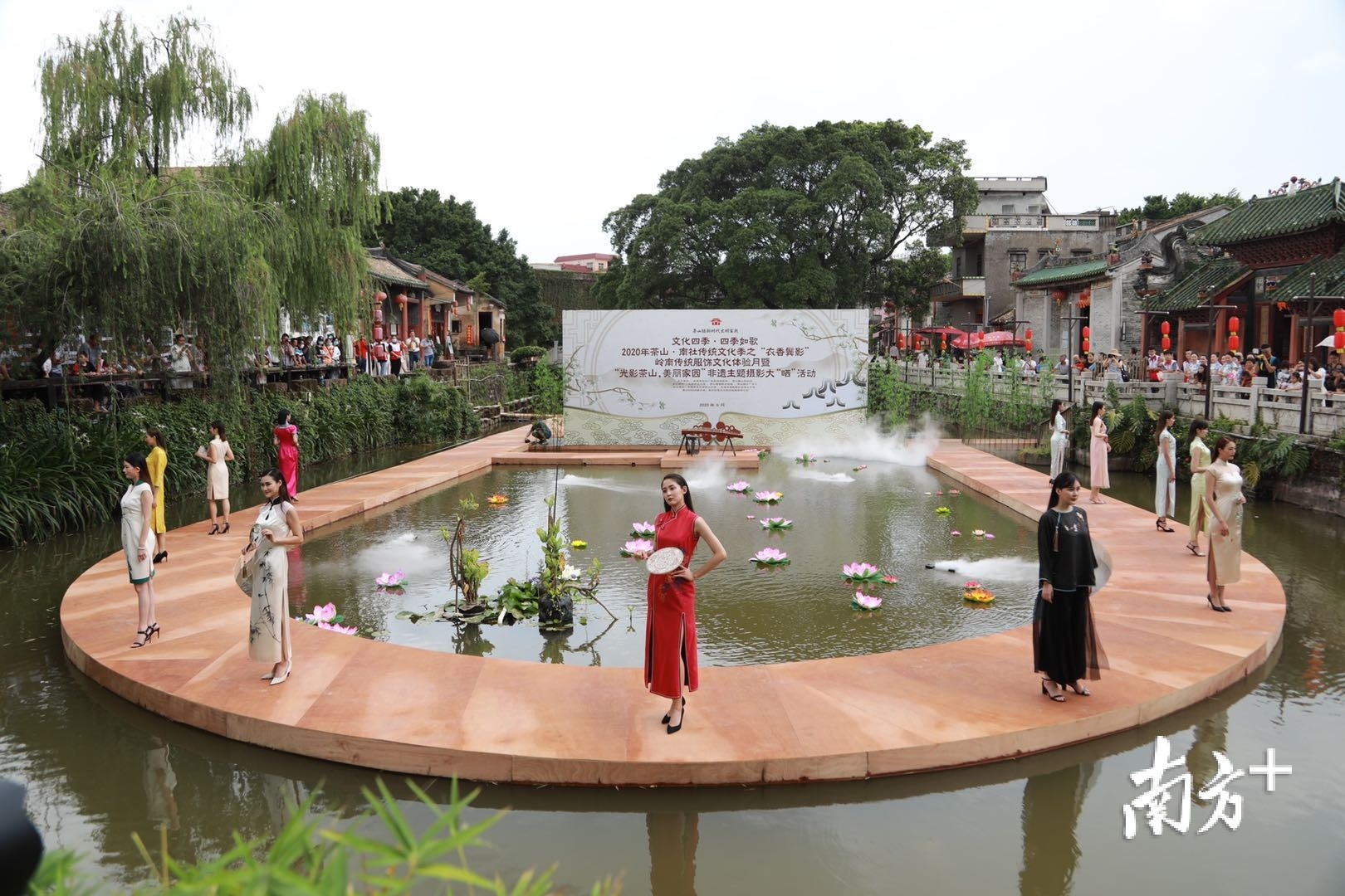 活动现场,南社明清古村落的池塘内香雾缭绕,U字型的T台悬浮在水面上与岭南古建筑相映衬,让整个场景显得古韵古香。