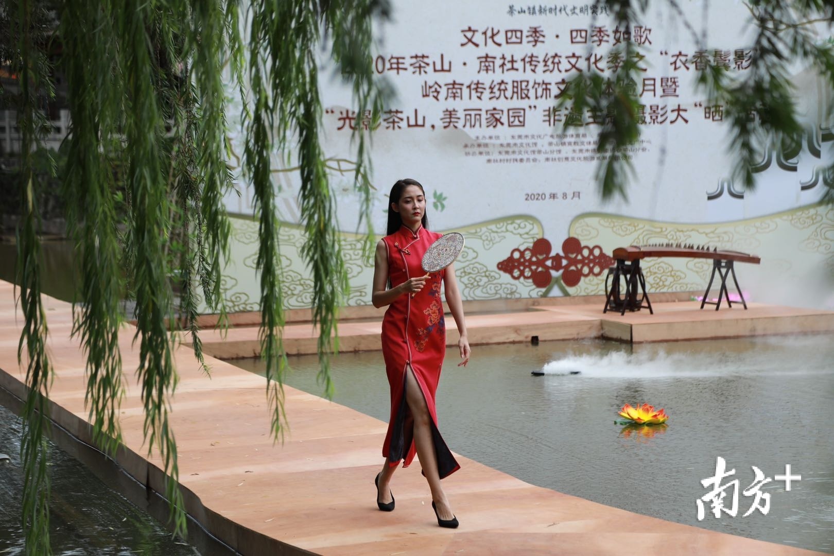 身穿旗袍的模特,伴随着流水、古琴音乐优雅地行走在T台上,让整个古村落变得更加美丽动人。