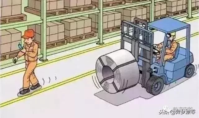 9.工人突然从行人通道走向机动车道,叉车司机急刹车,卷材滑出,将人压伤。