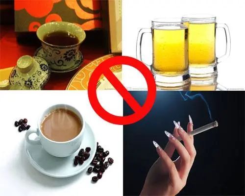 酒中的乙醇能溶解胃黏膜上皮的脂蛋白层,严重破坏胃黏膜的保护层。吸烟时烟草中的有害物质,残留在口腔及咽部,随吞咽可进入胃内,可对胃黏膜造成损害。浓茶中的茶碱,可刺激胃腺体对胃酸、胃蛋白酶的分泌增加,加重损伤胃黏膜。其鞣酸等物质还可直接刺激胃黏膜,引起胃的损伤。咖啡中的咖啡因直接损伤胃黏膜屏障。