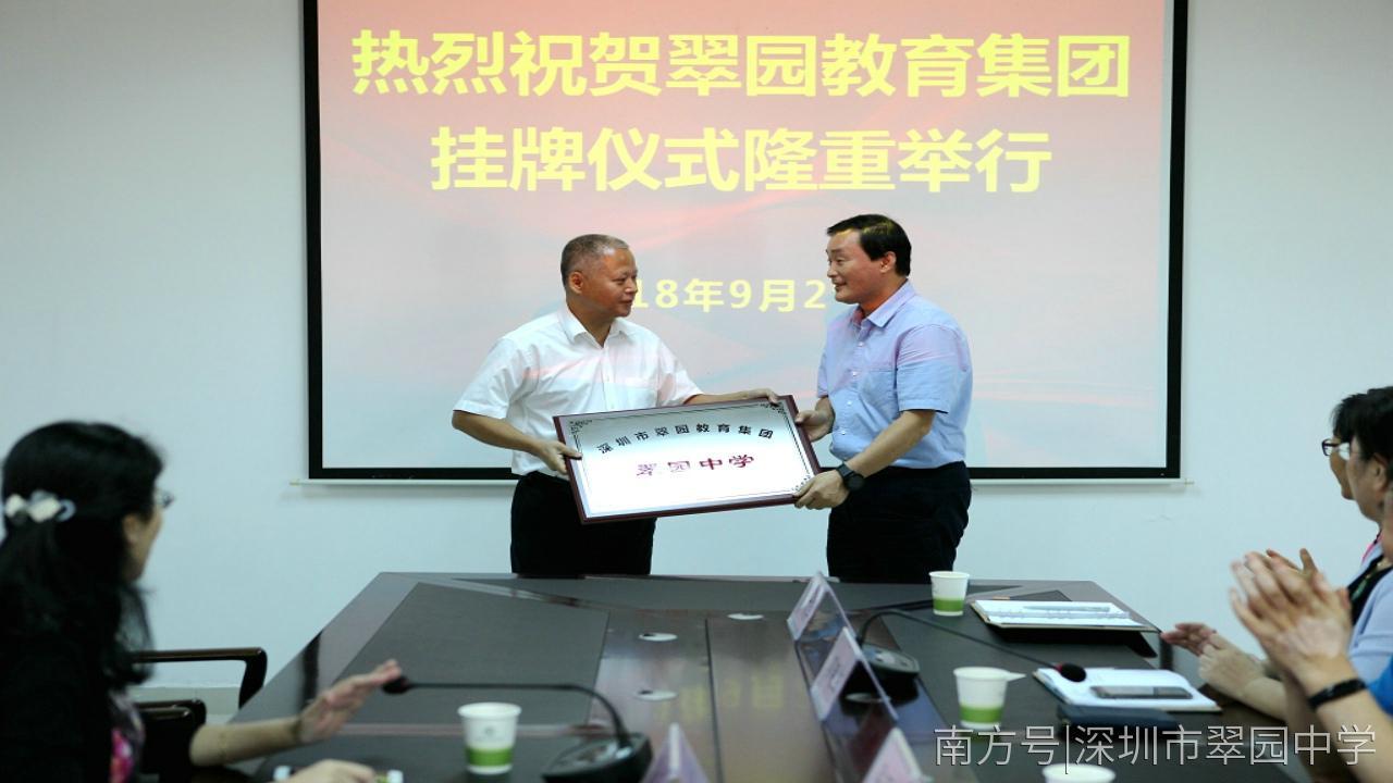 9 月 29 日上午,深圳市翠园教育集团挂牌仪式在翠园中学高中部举行。翠园教育集团以翠园中学高中部为龙头学校,涵盖翠园中学初中部、翠园中学东晓校区、文锦中学、松泉实验学校、黄贝学校(筹建)和鹏兴实验学校(民办)。韩冬青任翠园教育集团总校长。韩校长表示,翠园中学作为集团的龙头学校,将发挥模范带头作用,全面落实罗湖综改方案,积极推进“136”发展战略,向集团成员校输送先进理念和成功经验,在更大范围、更高层次、更深程度上实现教育的公平优质,真正办好人民群众满意的教育。