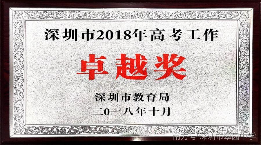 6月25日,2018年广东高考成绩放榜,翠园中学全面告捷,取得前所未有的卓越成绩,开创了翠园高考新纪元。王迪瑶同学总分名列全省第6名,勇夺深圳市文科状元,翠园中学跻身广东省顶尖学校之列。文理科共有2名学生高考裸分达清华、北大录取分数线,取得历史性突破。高分优先投档人数再次突破四百大关,达431人(不含艺术类考生),达线率71.36%(其中理科高达78.58%),创历史新高。2018年本科率高达99.34%,持续保持高位运行。9月7日,我校被授予2018“深圳市教育工作先进”称号。10月24日,我校再次获得“深圳市高考工作卓越奖”,并已连续18年荣获该奖项。