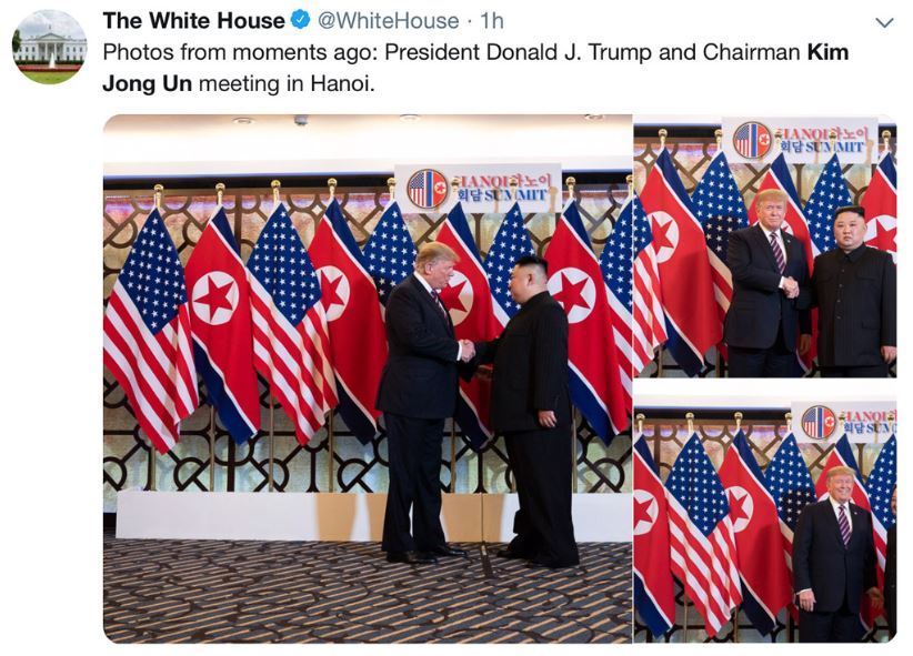 当地时间18时30分,金正恩与特朗普在河内索菲特传奇大都会酒店见面,两人在朝美两国共12面国旗组成的背景前握手,并向媒体致意。有报道称,两人将进行大约20分钟的简要交谈,并共进晚餐。