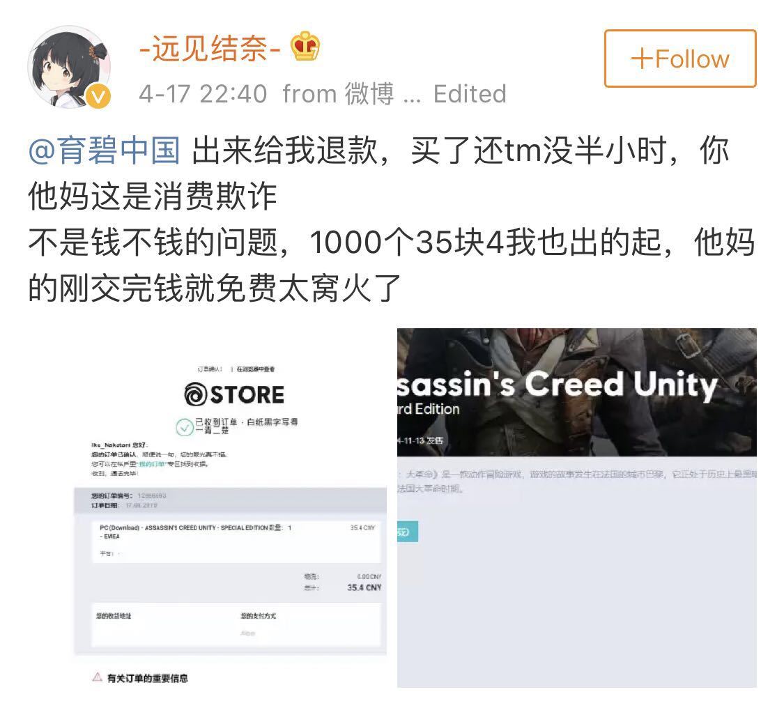 面对这一情况,玩家们的反应也各不一样。网友@-远见结奈- 就晒出了购买记录并@育碧中国要求退款,措辞十分激烈。