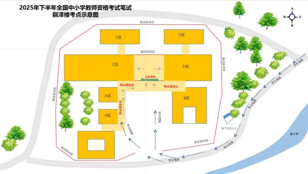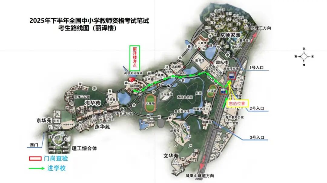 考生出入通道设置在校名石广场两侧(北师大隧道上方)的东门和东南门。考生经专用通道按沿途指示牌到达丽泽楼考场,考点校名石广场入口到丽泽楼考场步行需20分钟左右