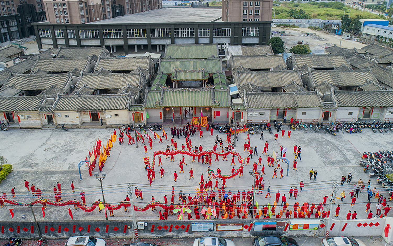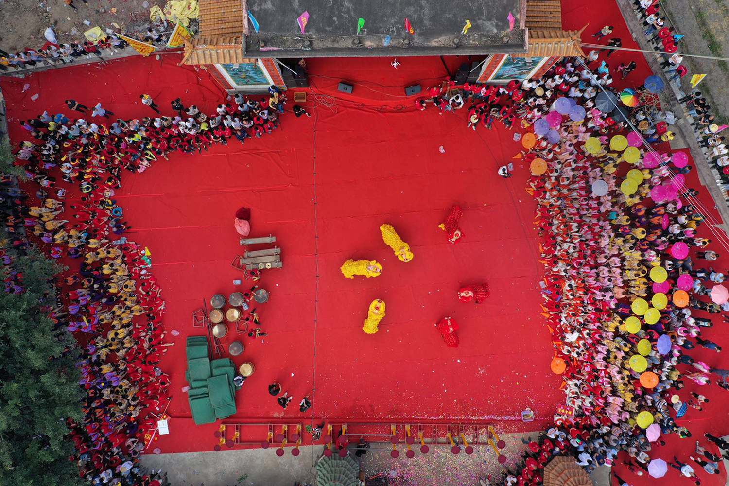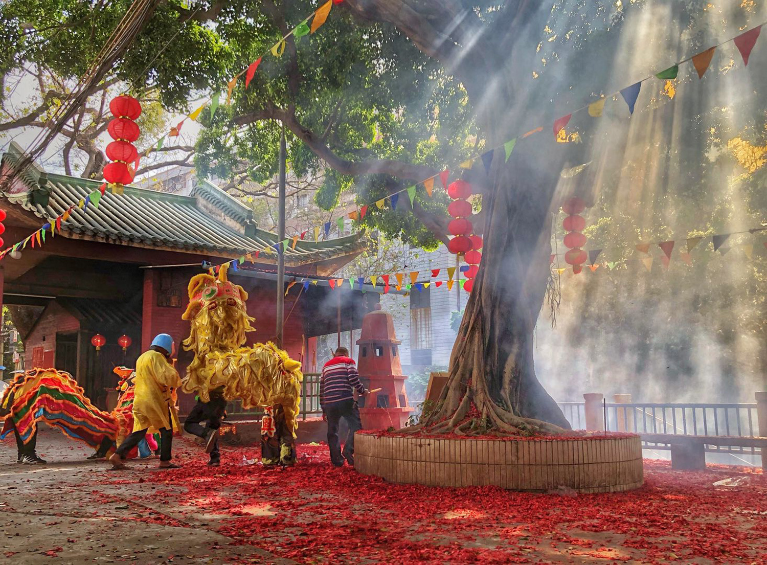 大年初一,佛山市顺德区龙江镇北头村锦绣北居醒狮队到水月宫为村民祈福,希望新的一年全村人人身体健康,家庭幸福,事业昌盛。周荣根 摄