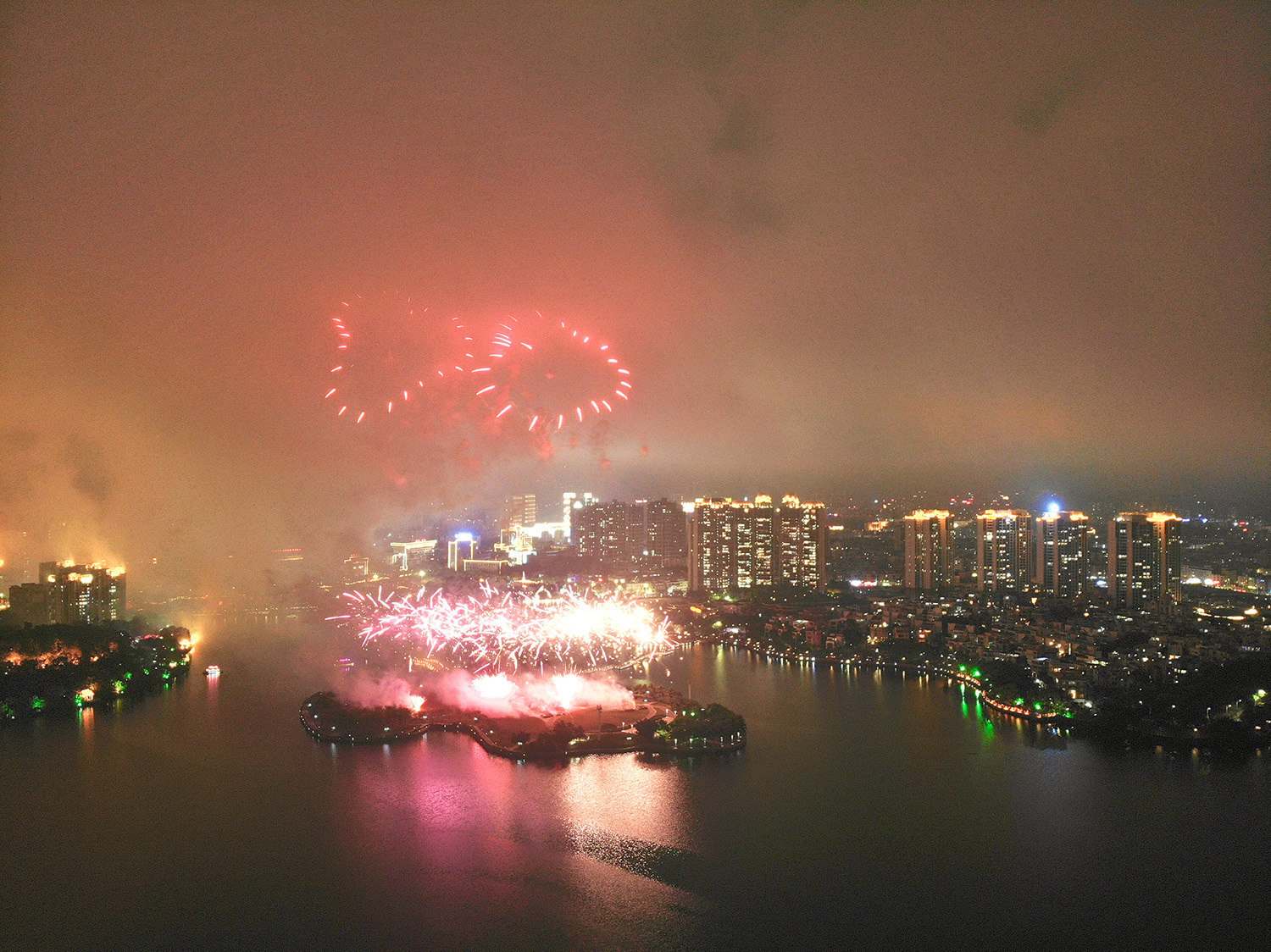 大年初二夜晚,阳江市鸳鸯湖上空演绎一出心心相印。刘正亮 摄