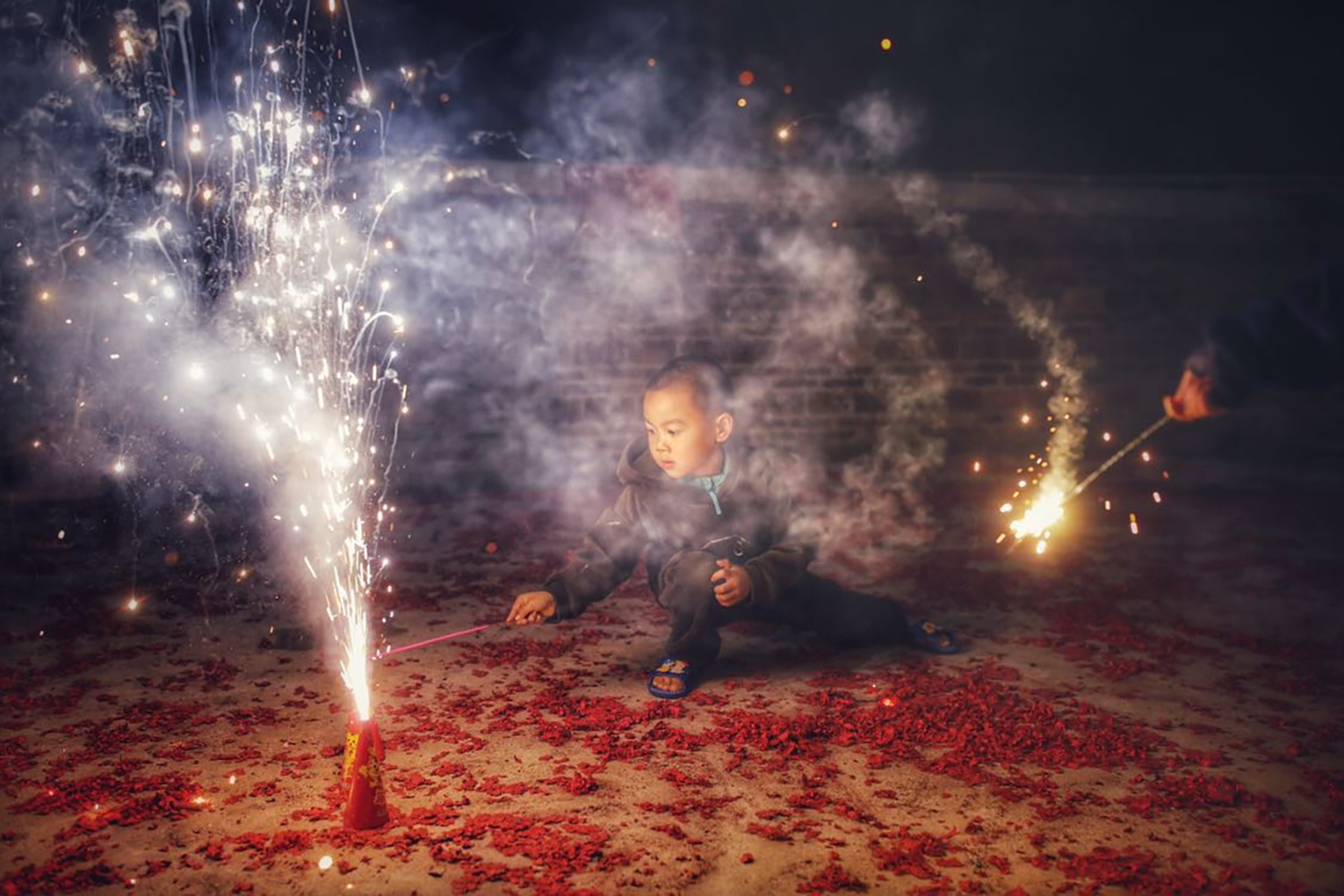 除夕夜,在河源市龙川县,小朋友在点燃烟火,迎接新年。新的一年,在红红火火的烟花爆竹中到来。马格西 摄