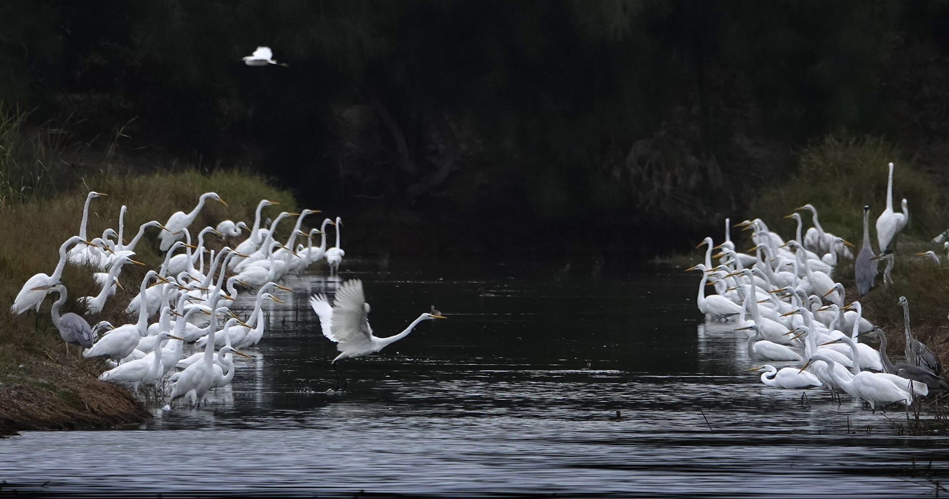 2月10日,一群白鹭在温暖的汕头濠江区湿地,水波荡漾、白鹭翩跹,构成了一副如诗的风景画。马卡 摄