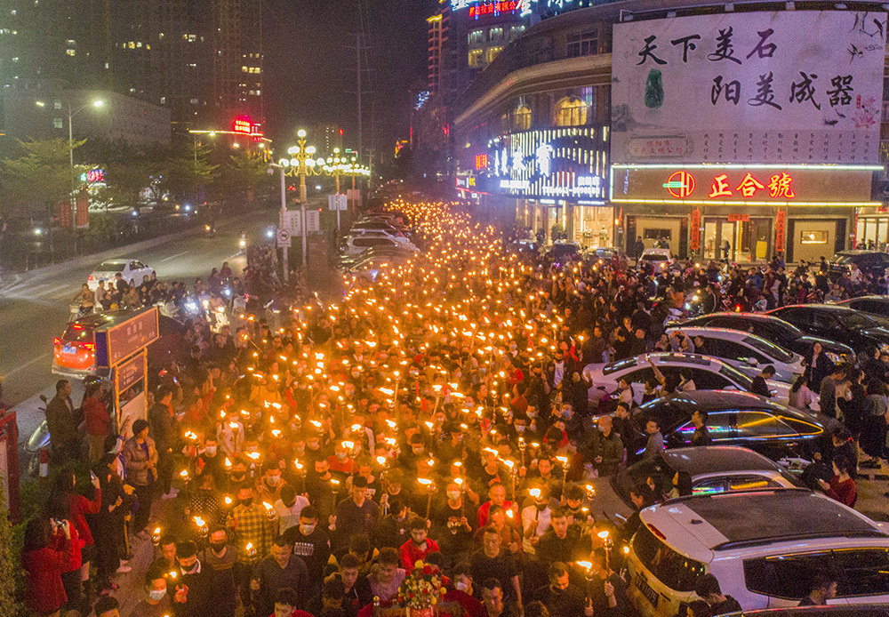 “火把节”是揭阳市产业园区磐东街道阳美村的传统民俗活动,每年正月初六,夜幕中的火把游行队伍宛如一条巨大的火龙在蜿蜒前进,人们手中燃烧的火把和一路璀璨的灯光映红了整个阳美。郑楚藩 摄