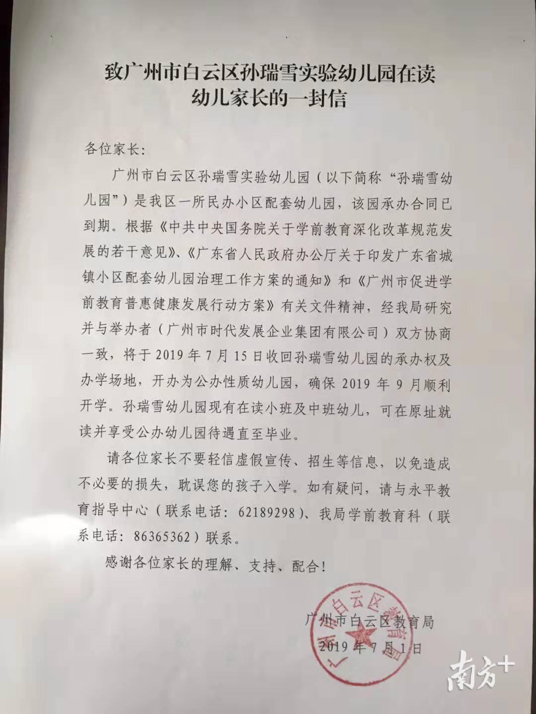 今年4月,白云区永平教育指导中心发出通知,决定于2019年9月1日将孙瑞雪幼儿园转为普惠性幼儿园。5月15日,白云区教育局再发通知表示,将收回孙瑞雪幼儿园的承办权和办学场地,改为公办幼儿园,过渡期两个月,7月15日是教育局规定的清场日期。5月25日、26日白云区教育局完成了新增公办幼儿园的招生工作。
