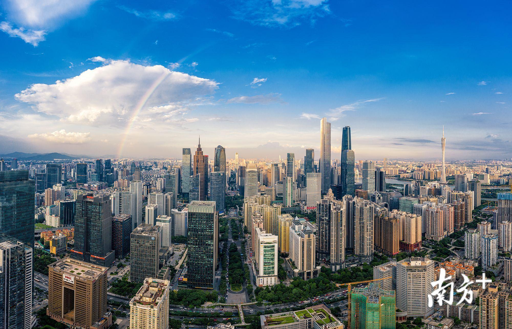 7月23日,临近下班之际,广州市区一场阵雨来袭,风雨之后天空突现美丽的双彩虹,与蓝天白云交相映衬。逸松 摄
