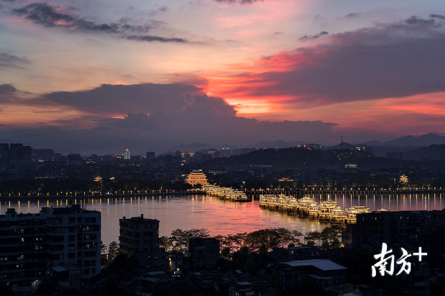 7月25日,日落时分,太阳的余光将天空染红,潮州广济桥也正好在此刻亮起金黄的光。陈灿铭 摄