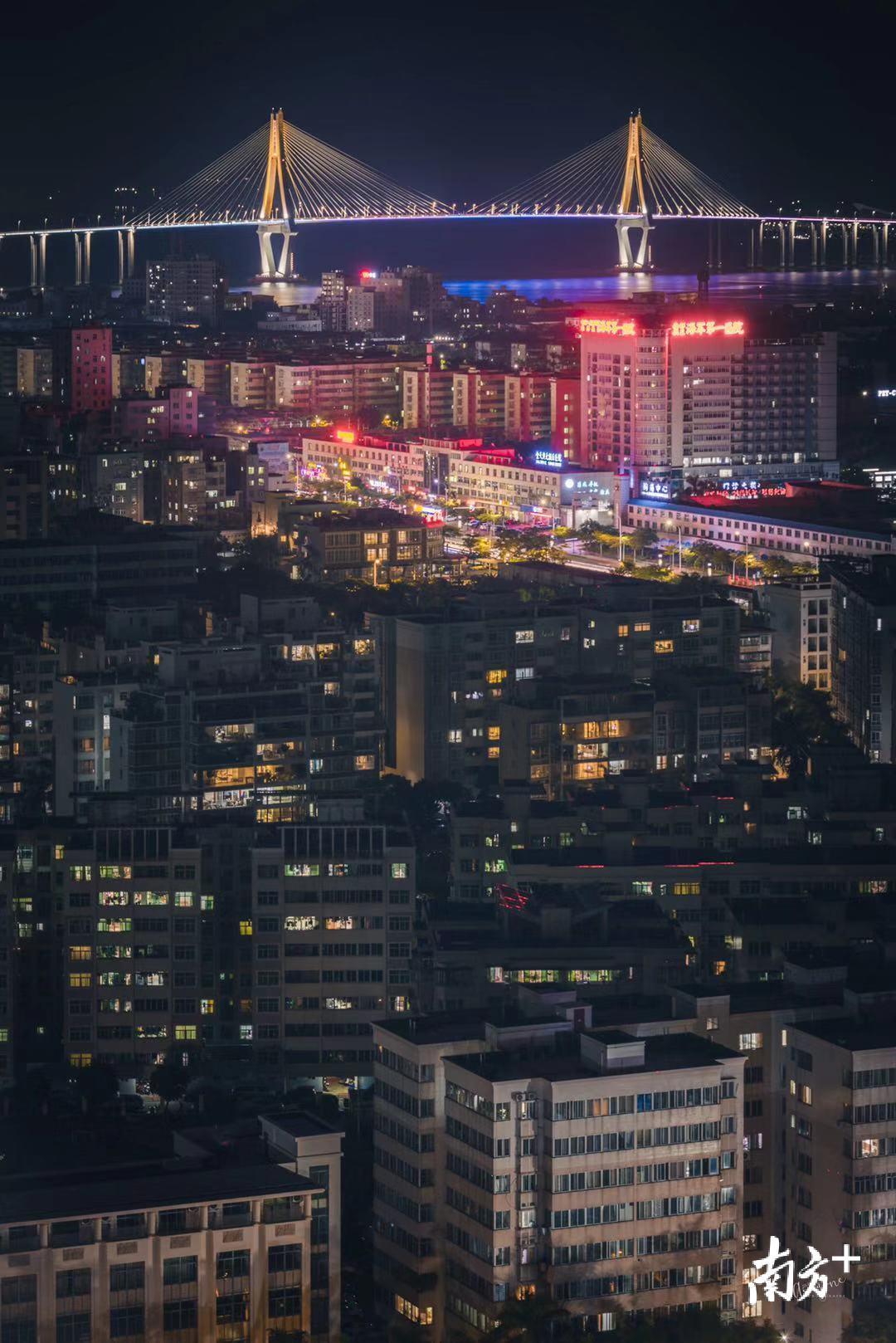 7月20日,湛江霞山区夜景,层层叠叠的楼层上方标志性建筑是湛江海湾大桥。ainyone 摄