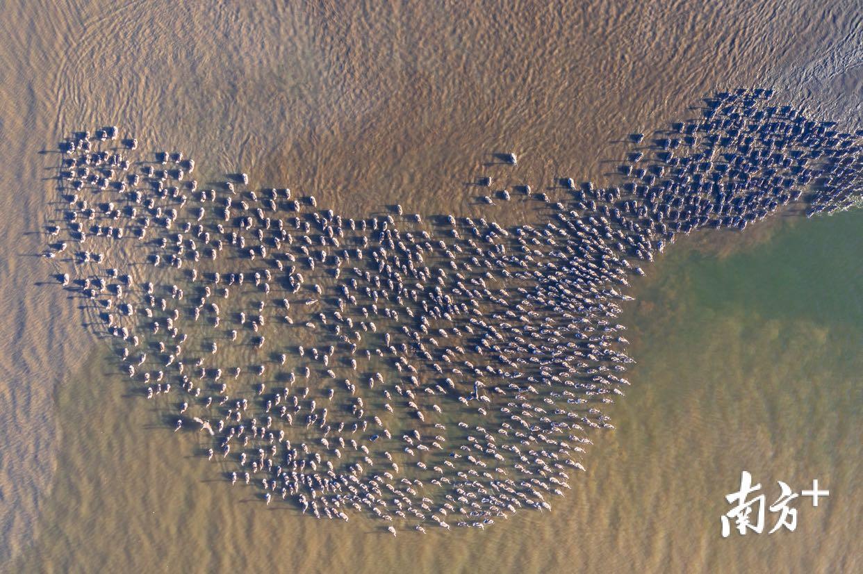 7月26日,昏黄的光线叫唤游荡在阳江漠阳江边的鹅群要归家了,游着游着的它们变成一只大鹅形状。刘正亮 摄