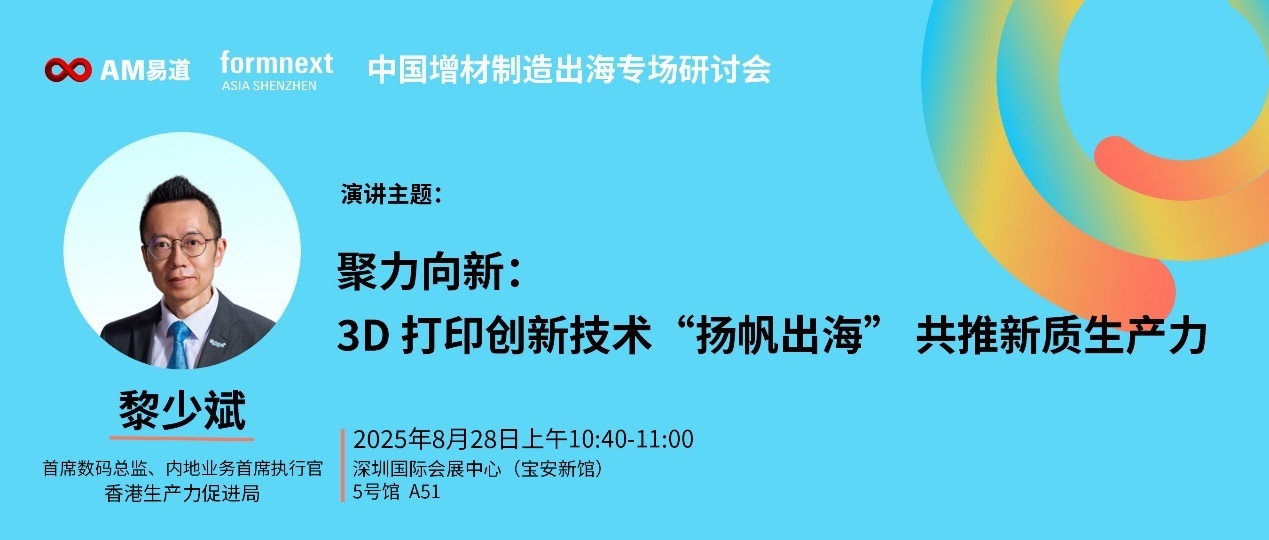 为支持大湾区企业迈向国际舞台,香港生产力促进局首席数码总监、内地业务首席执行官黎少斌还将参与展会同期活动之一、8月26日举办的“中国增材制造出海专场研讨会”,分享生产力局所积累的近30年丰富的行业和技术经验,以及如何凭借香港“背靠祖国、联通世界”的独特优势、生产力局成立的“The Cradle出海服务中心”,助力企业拓展全球市场发展的新机遇。