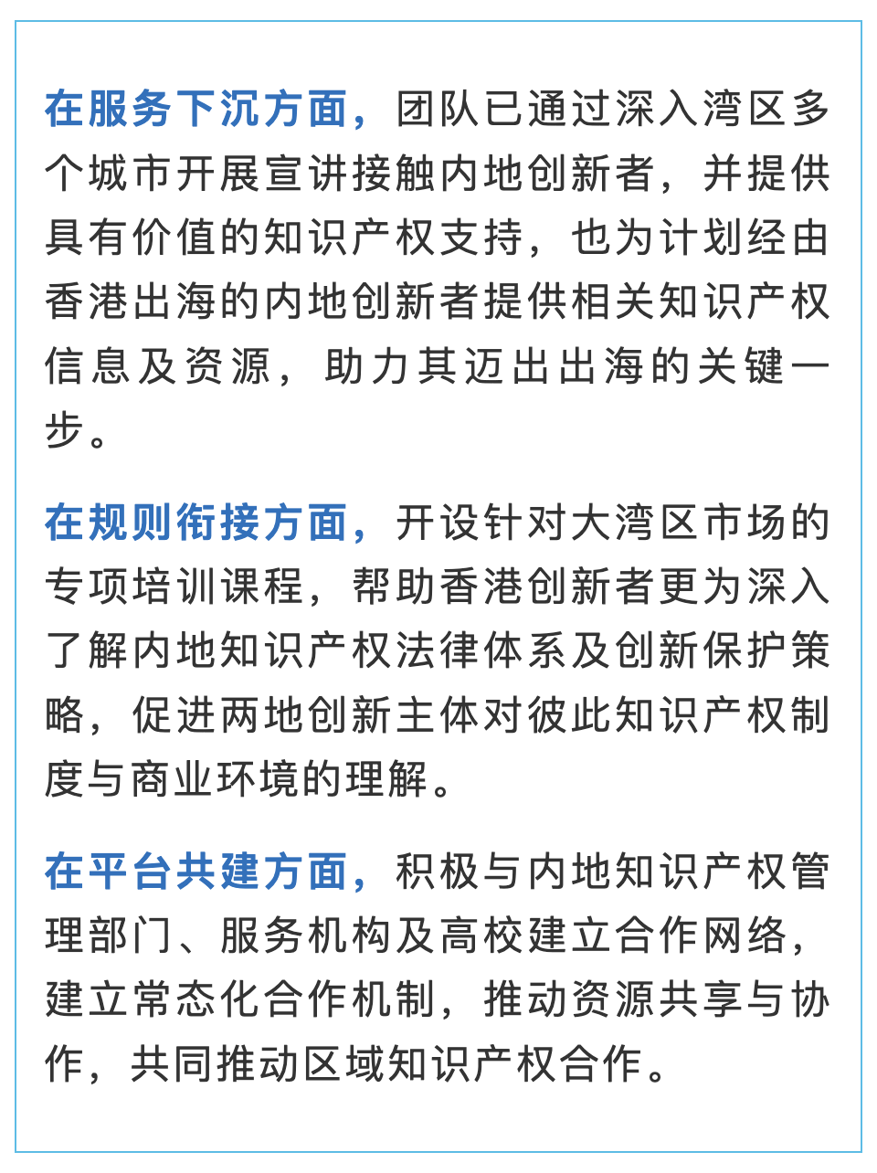 这些服务与机制,正是香港发挥其国际金融中心优势,探索知识产权金融创新,服务实体科技创新的具体体现,通过巩固企业竞争优势,帮助他们迈向高质量发展。