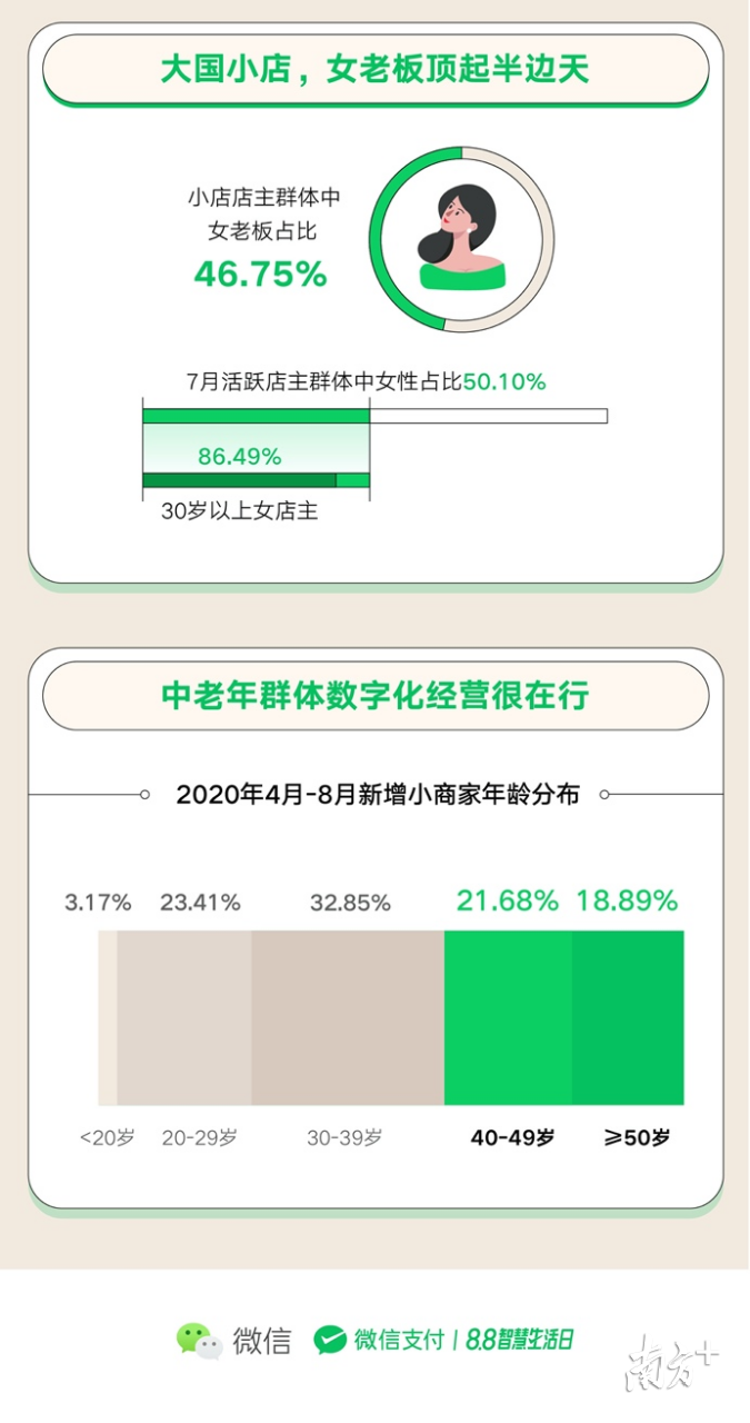 此外,小商家队伍日益多元化,无论年龄性别,都通过微信支付实现智慧经营。4月至8月新增的微信支付小商家中,近三分之一为30-39岁小商家,中老年小商家也“种草”数字化经营,新增微信支付小商家中21.68%为40-49岁商家,18.89%为50岁以上商家。小店女老板撑起“半边天”,7月活跃店主群体中50.1%为女性。