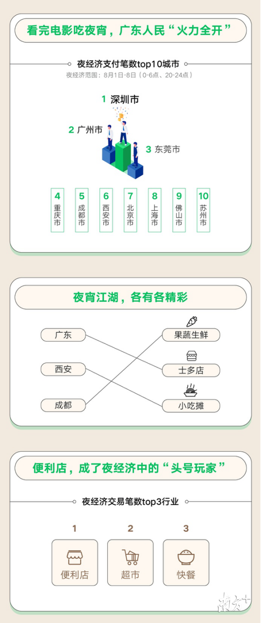 城市经济回暖,夜间生活也被“点亮”。“8.8智慧生活日”期间,深圳、广州、东莞、重庆、成都、西安、北京、上海、佛山、苏州名列全国夜间消费(20时-次日6时)活跃城市前十,其中便利店、快餐、超市消费活跃,占据城市夜间消费榜首。