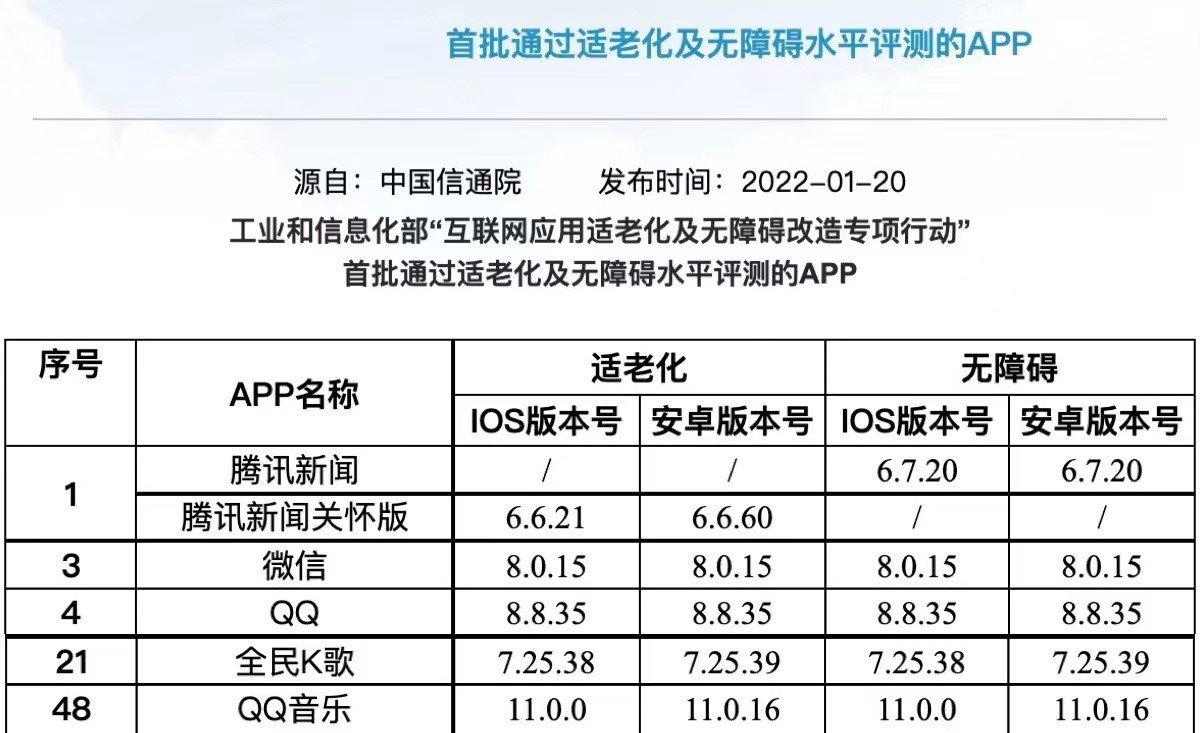 近日,工业和信息化部“互联网应用适老化及无障碍改造专项行动”,公布了首批通过适老化及无障碍水平评测的网站和APP,腾讯旗下的微信、QQ、QQ音乐、腾讯新闻、全民K歌、腾讯新闻等多款产品均首批通过评测。