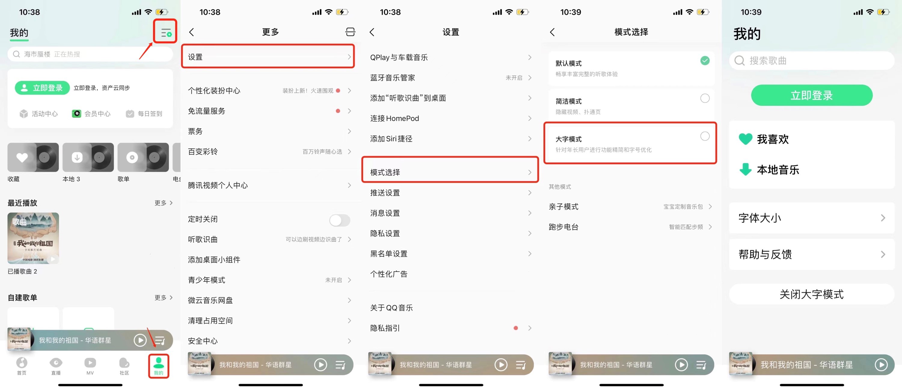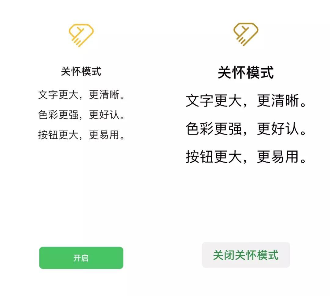 QQ:设置—通用—模式选择—更多模式,选择“关怀模式”。图为普通模式与关怀模式对比。