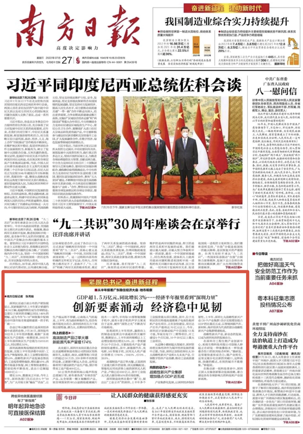 企业订单火爆的背后是深圳经济稳中求进的态势。7月26日,深圳发布2022年上半年经济数据。根据广东省地区生产总值统一核算结果,2022年上半年深圳地区生产总值为15016.91亿元,同比增长3.0%。